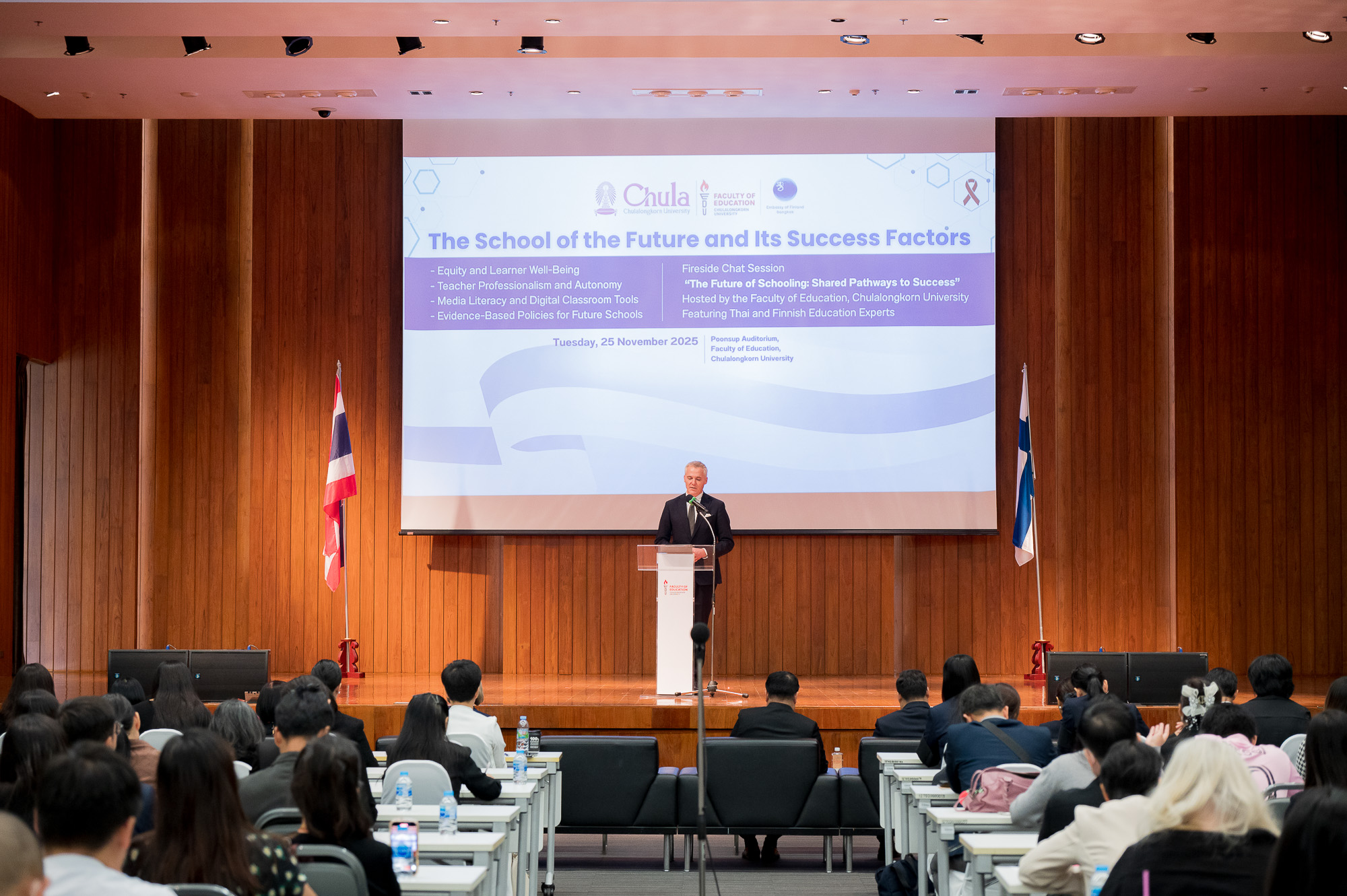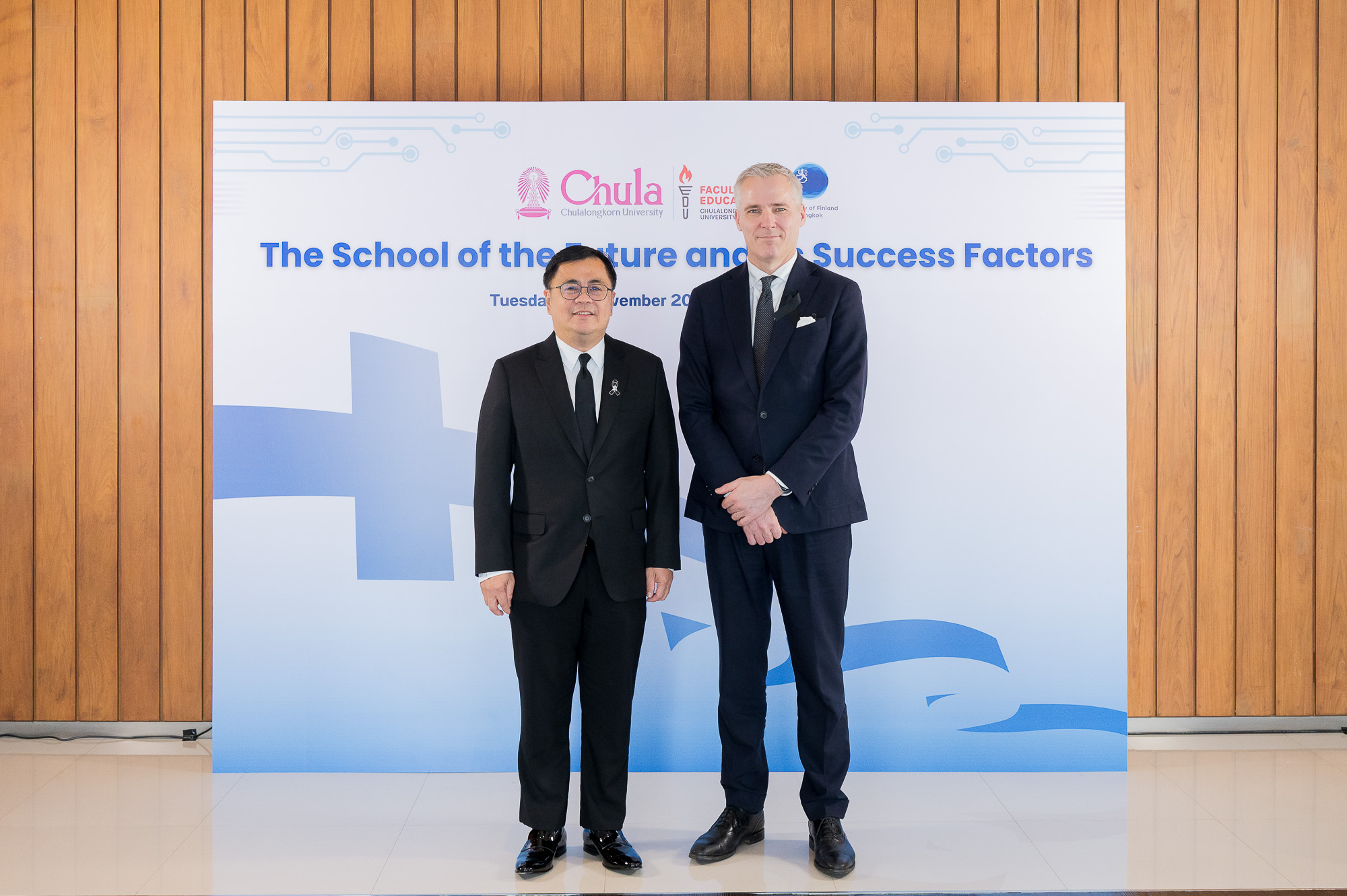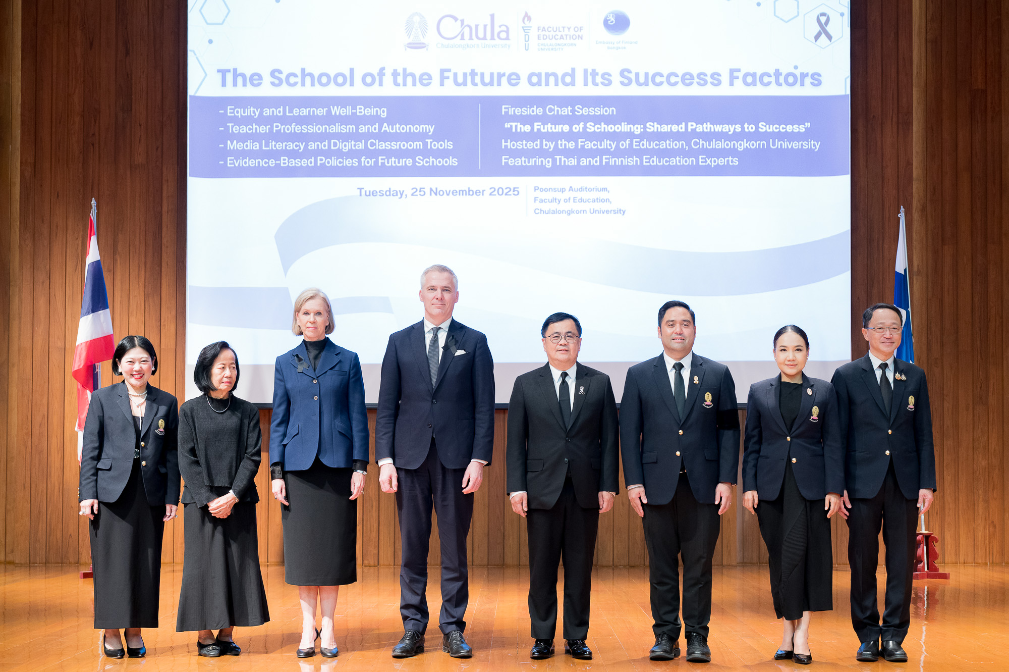 คณะครุศาสตร์ จุฬาลงกรณ์มหาวิทยาลัย ร่วมกับสถานเอกอัครราชทูตฟินแลนด์ประจำประเทศไทยจัดการบรรยายพิเศษหัวข้อ “The School of The Future and Its Success Factors” (โรงเรียนแห่งอนาคตและปัจจัยสู่ความสำเร็จ) เมื่อวันอังคารที่ 25 พฤศจิกายน 2568 ณ ห้องประชุมพูนทรัพย์ นพวงศ์ ณ อยุธยา ชั้น 3 อาคารพระมิ่งขวัญการศึกษาไทย คณะครุศาสตร์ จุฬาฯ เพื่อแลกเปลี่ยนมุมมองเกี่ยวกับการจัดการศึกษาในประเทศฟินแลนด์ ตลอดจนแนวทางความร่วมมือในการยกระดับระบบการศึกษาไทยสู่อนาคต โดยมี ศ.ดร.วิเลิศ ภูริวัชร อธิการบดีจุฬาฯ ผู้บริหารมหาวิทยาลัย รศ.ดร.ยศวีร์ สายฟ้า คณบดีคณะครุศาสตร์ จุฬาฯ และ รศ.ดร.วิทยา วัณณสุโภประสิทธิ์ คณบดีคณะวิศวกรรมศาสตร์ จุฬาฯ ร่วมต้อนรับ