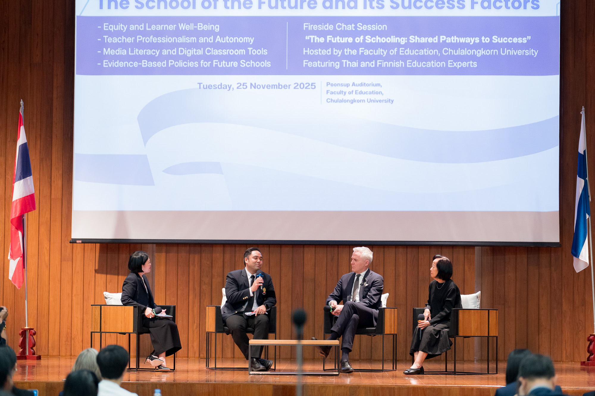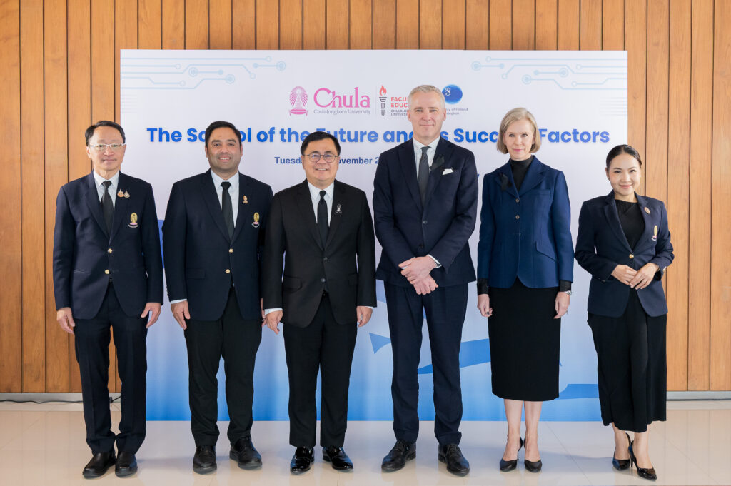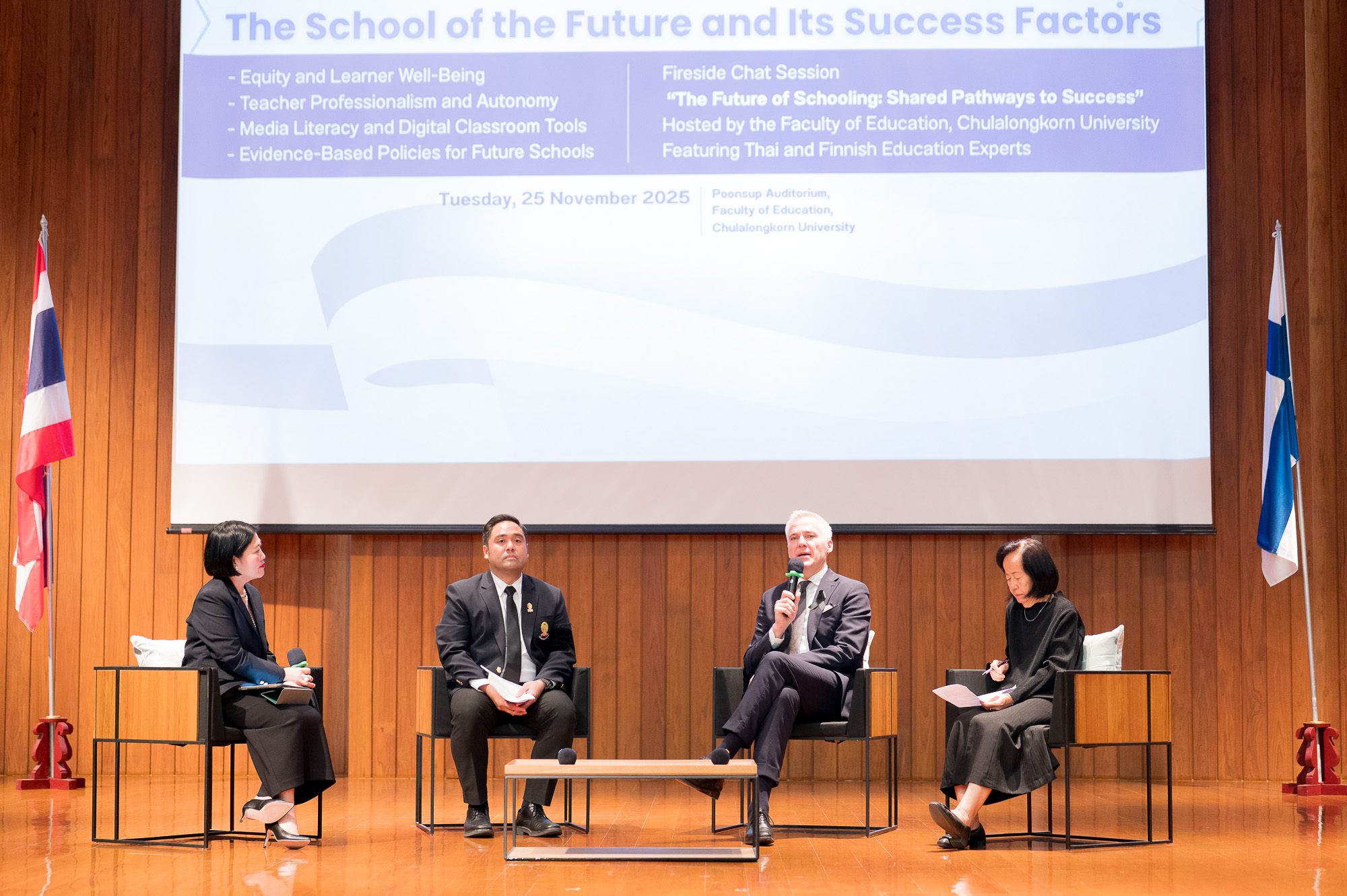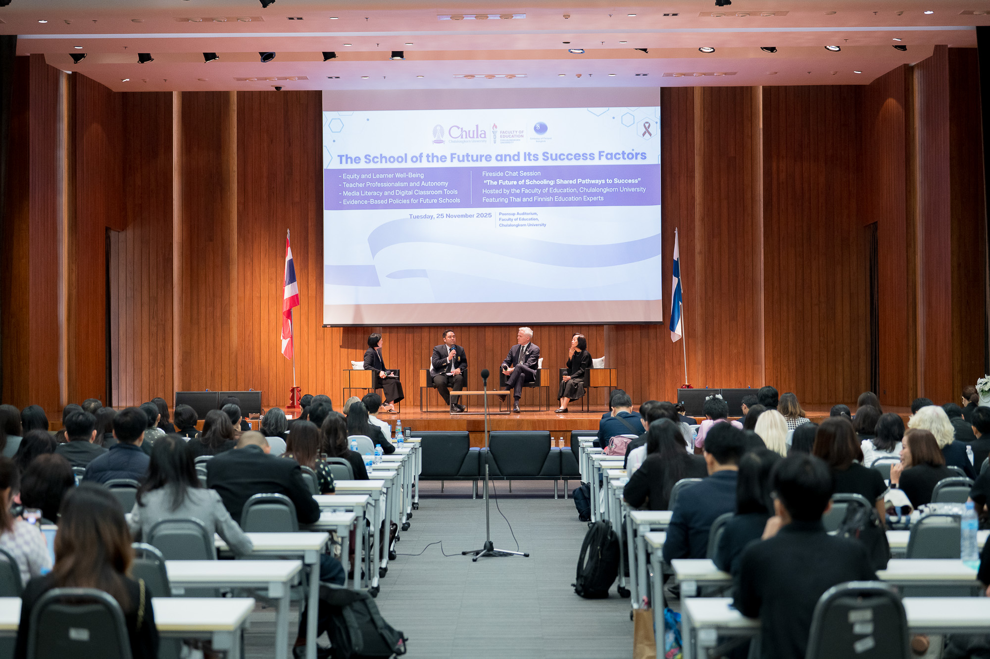 คณะครุศาสตร์ จุฬาลงกรณ์มหาวิทยาลัย ร่วมกับสถานเอกอัครราชทูตฟินแลนด์ประจำประเทศไทยจัดการบรรยายพิเศษหัวข้อ “The School of The Future and Its Success Factors” (โรงเรียนแห่งอนาคตและปัจจัยสู่ความสำเร็จ) เมื่อวันอังคารที่ 25 พฤศจิกายน 2568 ณ ห้องประชุมพูนทรัพย์ นพวงศ์ ณ อยุธยา ชั้น 3 อาคารพระมิ่งขวัญการศึกษาไทย คณะครุศาสตร์ จุฬาฯ เพื่อแลกเปลี่ยนมุมมองเกี่ยวกับการจัดการศึกษาในประเทศฟินแลนด์ ตลอดจนแนวทางความร่วมมือในการยกระดับระบบการศึกษาไทยสู่อนาคต โดยมี ศ.ดร.วิเลิศ ภูริวัชร อธิการบดีจุฬาฯ ผู้บริหารมหาวิทยาลัย รศ.ดร.ยศวีร์ สายฟ้า คณบดีคณะครุศาสตร์ จุฬาฯ และ รศ.ดร.วิทยา วัณณสุโภประสิทธิ์ คณบดีคณะวิศวกรรมศาสตร์ จุฬาฯ ร่วมต้อนรับ