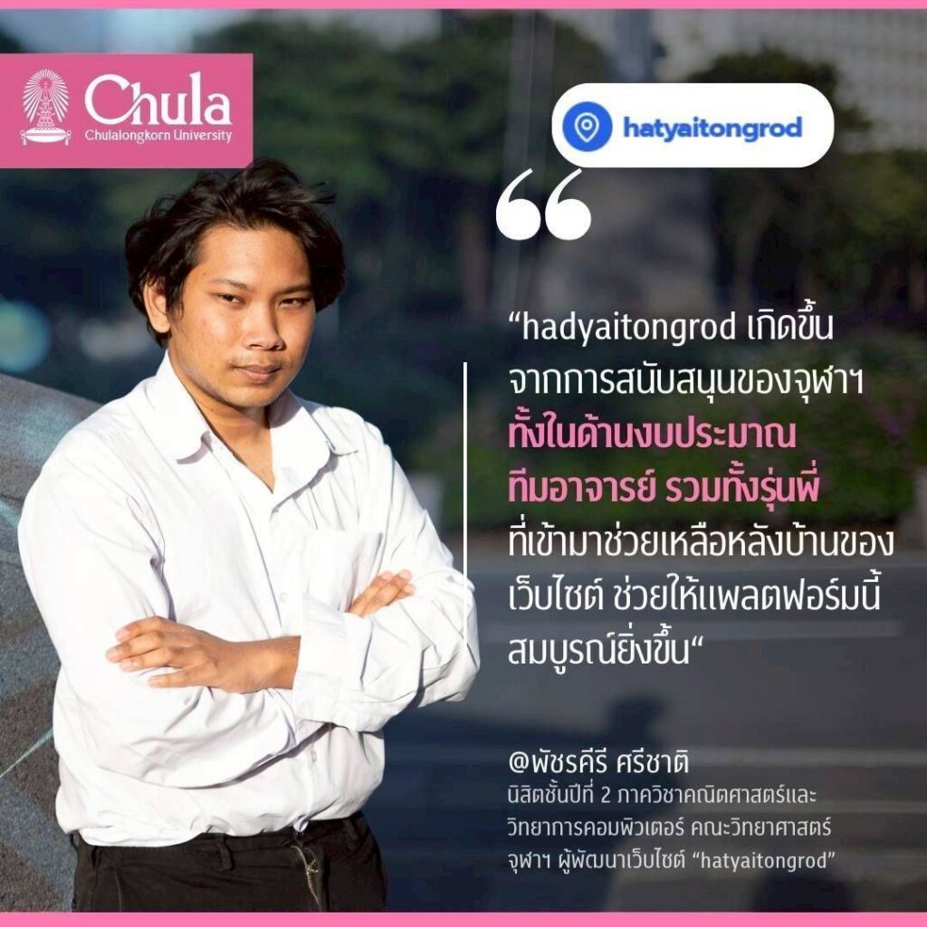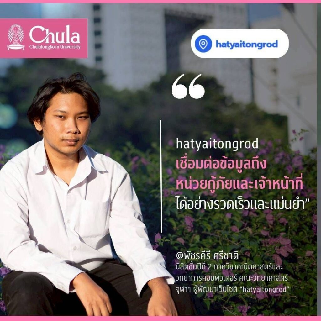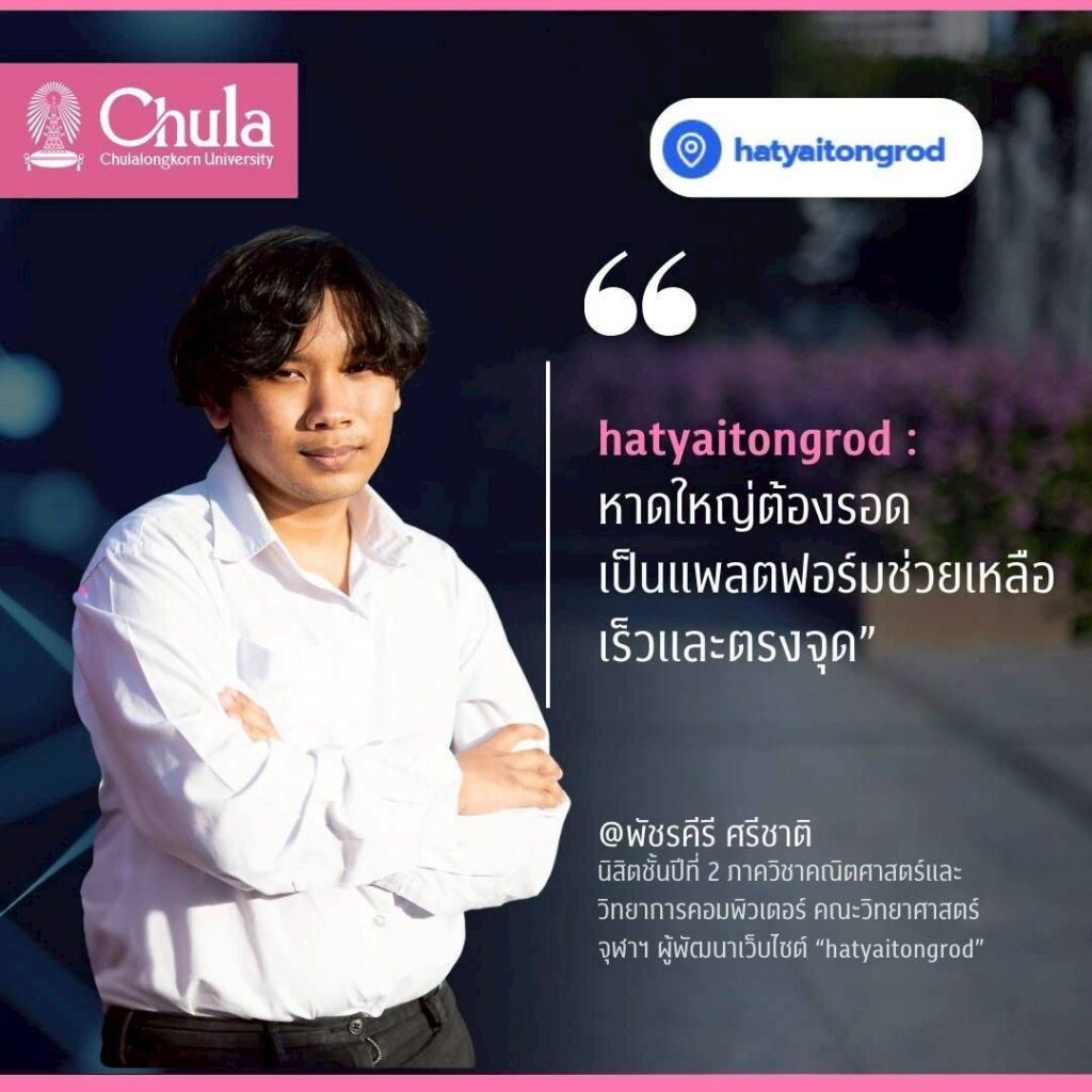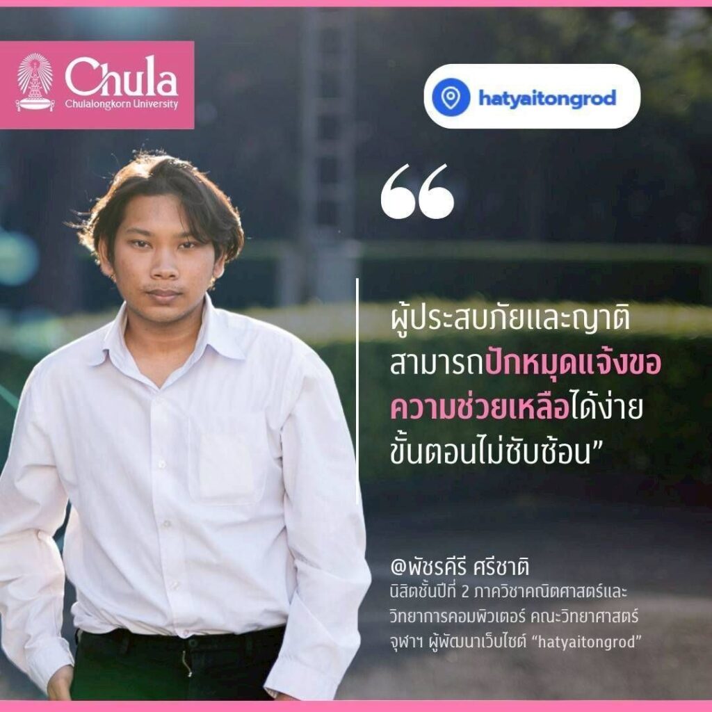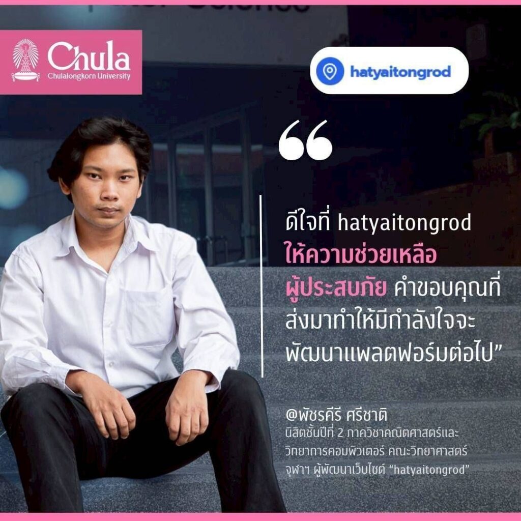 พัชรคีรี ศรีชาติ นิสิตชั้นปีที่ 2 ภาควิชาคณิตศาสตร์และวิทยาการคอมพิวเตอร์ คณะวิทยาศาสตร์ จุฬาฯ ผู้พัฒนาเว็บไซต์ “hatyaitongrod” เปิดเผยว่าเว็บไซต์นี้เป็นแพลตฟอร์มให้ความช่วยเหลือผู้ประสบอุทกภัยในพื้นที่ภาคใต้ โดยผู้ประสบภัยสามารถปักหมุดที่อยู่อาศัยเพื่อแจ้งความช่วยเหลือได้อย่างรวดเร็วและตรงจุด ทำให้หน่วยงานที่เกี่ยวข้อง ตลอดจนจิตอาสา อาสาสมัคร เจ้าหน้าที่ทหาร หรือหน่วยกู้ภัยสามารถเปิดดูแผนที่ปักหมุดของผู้ประสบภัย และให้ความช่วยเหลือได้อย่างมีประสิทธิภาพ รวดเร็วและแม่นยำ