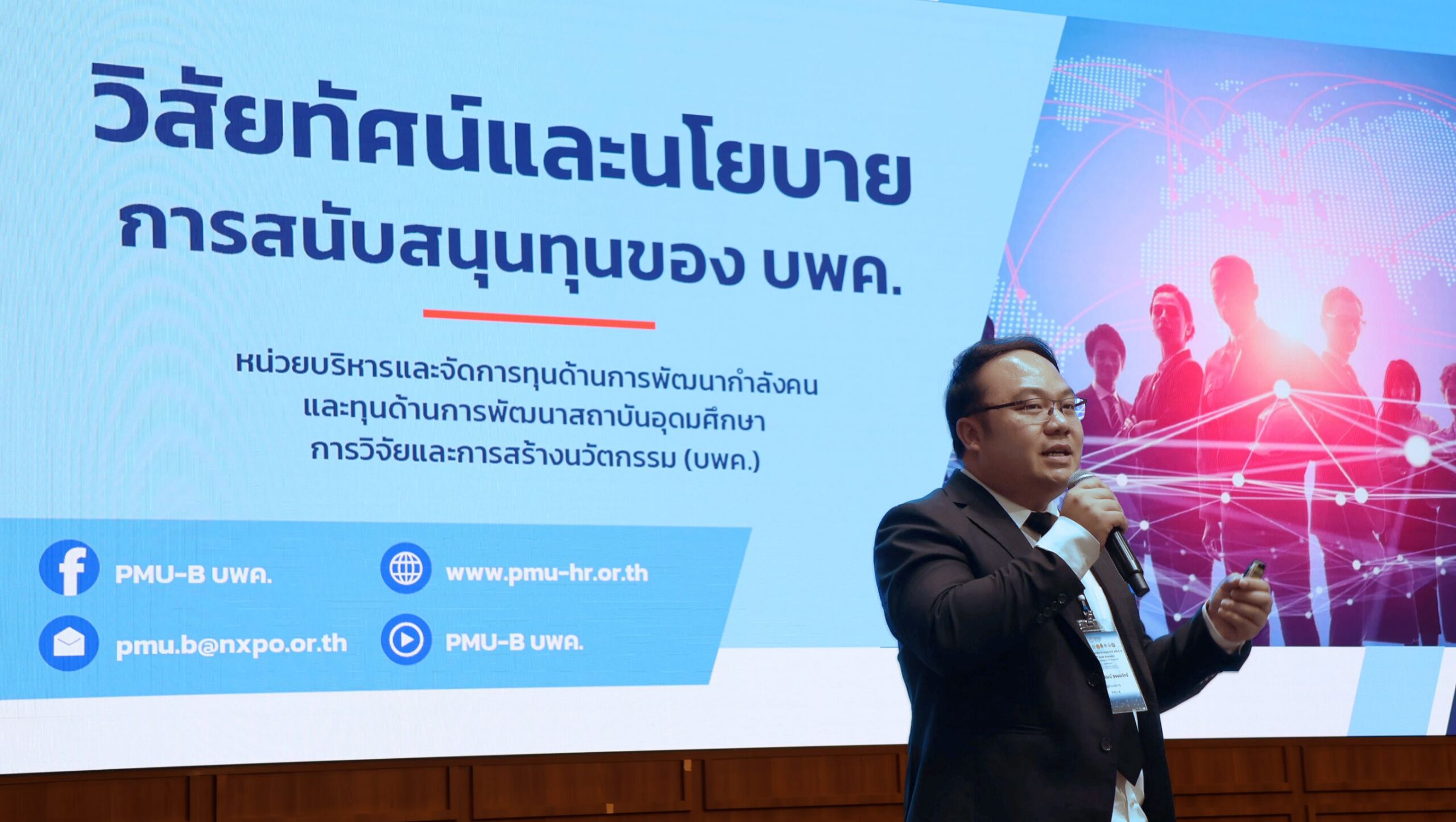 นอกจากนี้ ยังได้รับเกียรติจาก ดร.ณิรวัฒน์ ธรรมจักร ผู้อำนวยการหน่วยบริหารและจัดการทุนด้านการพัฒนากำลังคนและทุนด้านการพัฒนาสถาบันอุดมศึกษาการวิจัยและสร้างนวัตกรรม (บพค.) นำเสนอวิสัยทัศน์และนโยบายการสนับสนุนทุนวิจัย และเสวนาพิเศษในหัวข้อ “ยกระดับเศรษฐกิจของประเทศด้วยวิจัยและนวัตกรรม” โดย มล.ภาสกร อาภากร ผู้อำนวยการสำนักส่งเสริมมูลค่าเพิ่มเพื่อการค้า กรมส่งเสริมการค้าระหว่างประเทศ กระทรวงพาณิชย์ และ “Global collaboration is the way to secure and enhance country’s competitiveness” โดย Mr. Andrew Egan, Minister and deputy head of mission, Australian embassy in Bangkok Thailand