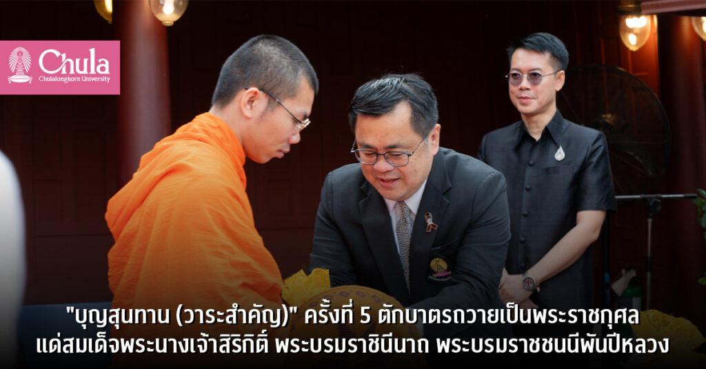 ธรรมสถานจุฬาฯ สำนักบริหารศิลปวัฒนธรรมจุฬาฯ จัดกิจกรรม “บุญสุนทาน (วาระสำคัญ)” ครั้งที่ 5 ตักบาตรถวายเป็นพระราชกุศลแด่สมเด็จพระนางเจ้าสิริกิติ์ พระบรมราชินีนาถ พระบรมราชชนนีพันปีหลวง เมื่อวันศุกร์ที่ 28 พฤศจิกายน 2568 ณ เรือนไทยจุฬาฯ โดยมี ศ.ดร.วิเลิศ ภูริวัชร อธิการบดีจุฬาฯ พร้อมด้วยผู้บริหารมหาวิทยาลัย คณาจารย์ บุคลากร และนิสิตจุฬาฯ ร่วมตักบาตรพระสงฆ์จำนวน 10 รูปจากวัดสระเกศ โดยได้รับความเมตตาจากพระมหาศักดา สุญาโณ ป.ธ.7 อาจารย์ใหญ่ฝ่ายบาลีสำนักเรียนวัดสระเกศ และพระพิธีธรรมประจำสำนักวัดสระเกศ เป็นประธานสงฆ์