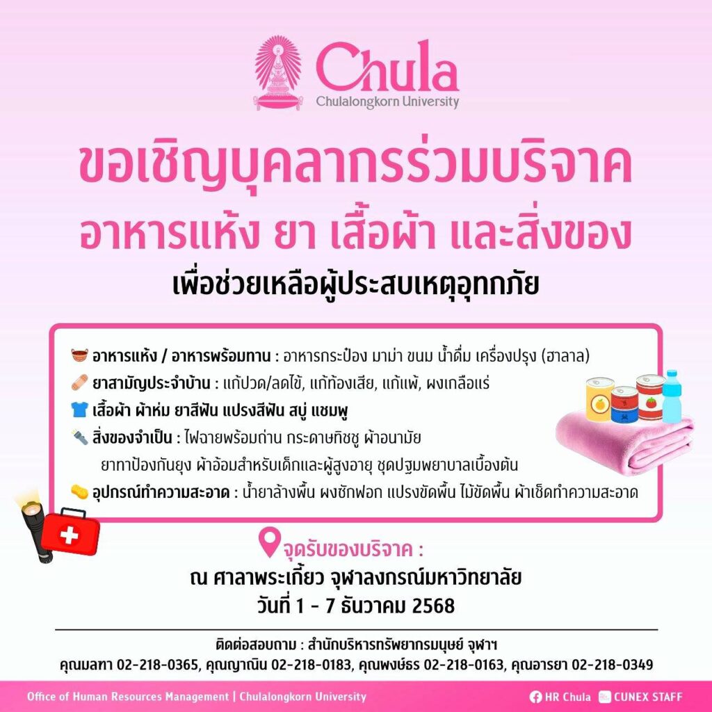 ทั้งนี้ชาวจุฬาฯ ยังสามารถร่วมบริจาคอาหารแห้ง ยา เสื้อผ้า สิ่งของได้ที่ศาลาพระเกี้ยว จุฬาลงกรณ์มหาวิทยาลัย ตั้งแต่วันที่ 1 – 7 ธันวาคม 2568