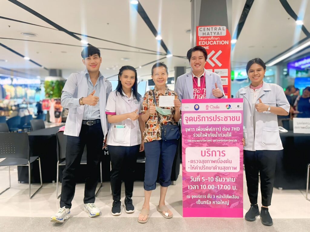 จุฬาลงกรณ์มหาวิทยาลัยโดยคณะพยาบาลศาสตร์ จุฬาฯ ร่วมกับมูลนิธิอาสาเพื่อนพึ่ง (ภาฯ) ยามยาก สภากาชาดไทย สถานีโทรทัศน์ช่อง 7HD และเครือข่ายจุฬาฯ ฝ่าภัยน้ำท่วมใต้ ออกหน่วยให้บริการแก่ประชาชนชาวหาดใหญ่ จังหวัดสงขลาที่ได้รับผลกระทบจากอุทกภัยทางภาคใต้ เมื่อวันที่ 5 ธันวาคม 2568 บริเวณชั้น 3 ห้างสรรพสินค้าเซ็นทรัลเฟสติวัลหาดใหญ่ และบริเวณชุมชนสถานีรถไฟหาดใหญ่ อำเภอหาดใหญ่ จังหวัดสงขลา มีประชาชนมารับบริการจำนวน 78 ราย ปัญหาที่พบส่วนใหญ่ได้แก่ น้ำกัดเท้า ปวดเมื่อยตามตัว นอนไม่หลับ เครียด มีผื่นตามตัว และขาดยาประจำตัว