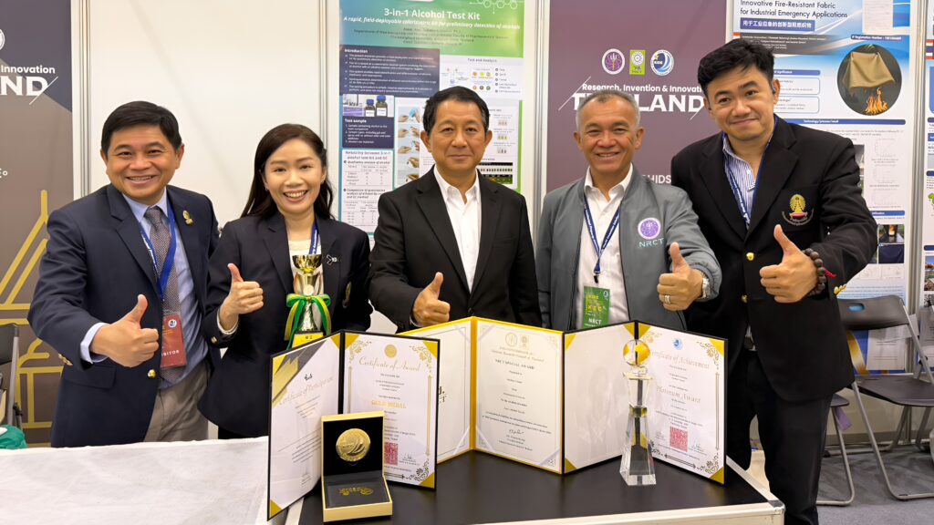 ศาสตราจารย์ นายแพทย์รังสรรค์ ฤกษ์นิมิต ผู้ช่วยอธิการบดี ด้านนวัตกรรม จุฬาลงกรณ์มหาวิทยาลัย ร่วมแสดงความยินดีกับรองศาสตราจารย์ ดร.ศุภกาญจน์ ชำนิ จากคณะเภสัชศาสตร์ ผลงานเรื่อง “ชุดทดสอบแอลกอฮอล์เบื้องต้นด้วยตนเอง” (Q-E-S-T 3-in-1 Alcohol Test Kit) เพื่อตรวจสอบมาตรฐานและความปลอดภัยของแอลกอฮอล์ฆ่าเชื้อที่อยู่ในผลิตภัณฑ์เจลและน้ำเพื่อการทำความสะอาด โดยสารเคมีที่ใช้ในการทดลองมีความปลอดภัยและผ่านมาตรฐานจากสถาบันมาตรวิทยาประเทศไทย ซึ่งผลงานนี้ได้รับรางวัล Platinum award และ รางวัล Excellent Invention ของ NRCT special award จากสำนักงานการวิจัยแห่งชาติ (วช.)