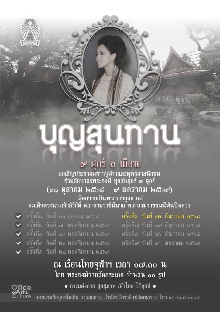 ธรรมสถานจุฬาฯ สำนักบริหารศิลปวัฒนธรรมจุฬาฯ จัดกิจกรรม “บุญสุนทาน (วาระสำคัญ)” ครั้งที่ 6 ตักบาตรถวายเป็นพระราชกุศลแด่สมเด็จพระนางเจ้าสิริกิติ์ พระบรมราชินีนาถ พระบรมราชชนนีพันปีหลวง ณ เรือนไทยจุฬาฯ ในวันที่ 12 ธันวาคม 2568
