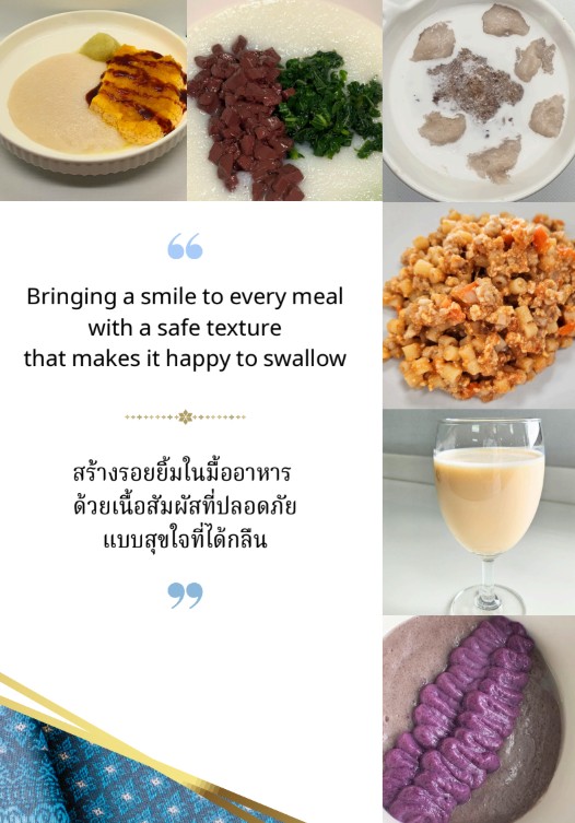 จากความสำเร็จในการจัดทำ “46 เมนูอาหารฝึกกลืนตามมาตรฐานสากล IDDSI” หนังสือตำรับอาหารเล่มแรกของประเทศไทย เพื่อการดูแลผู้สูงอายุและผู้ป่วยที่มีภาวะเคี้ยวกลืนลำบาก ผศ.ดร.วรัญญา เตชะสุขถาวร ภาควิชาโภชนาการและการกำหนดอาหาร คณะสหเวชศาสตร์ จุฬาฯ และทีมวิจัย ได้ต่อยอดงานวิจัยด้านอาหารดัดแปลงเนื้อสัมผัส (Texture-Modified Food) สู่การใช้งานจริงอย่างเป็นรูปธรรม ด้วยการเปิดตัวหนังสือ “สุขใจที่ได้กลืน: 52 สูตรอาหารง่ายๆ สำหรับมื้ออาหารฝึกกลืนแสนอร่อย” รวบรวมสุดยอดตำรับอาหารไทย ขนม และเครื่องดื่มที่ได้รับการพัฒนาสูตรมาอย่างพิถีพิถันจากห้องปฏิบัติการครัว เพื่อมุ่งหวังช่วยยกระดับคุณภาพชีวิตและโภชนาการที่เหมาะสมแก่ผู้สูงอายุและผู้ที่มีภาวะกลืนลำบาก (Dysphagia) ให้สามารถรับประทานอาหารได้อย่างปลอดภัย ถูกหลักโภชนาการ และยกระดับคุณภาพชีวิตให้มีความสุขกับมื้ออาหาร