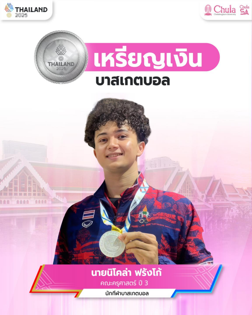 นายนิโคล่า ฟรังโก้ นิสิตคณะครุศาสตร์ ชั้นปีที่ 2ในกีฬาบาสเกตบอล ประเภท Basketball – 5×5