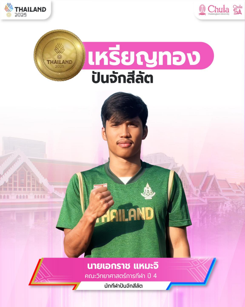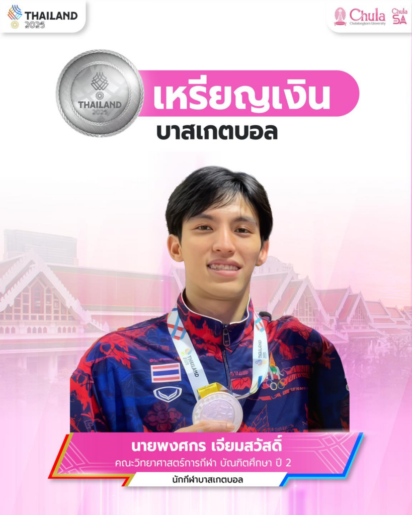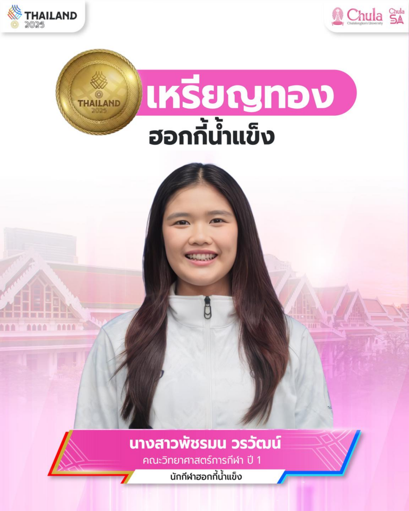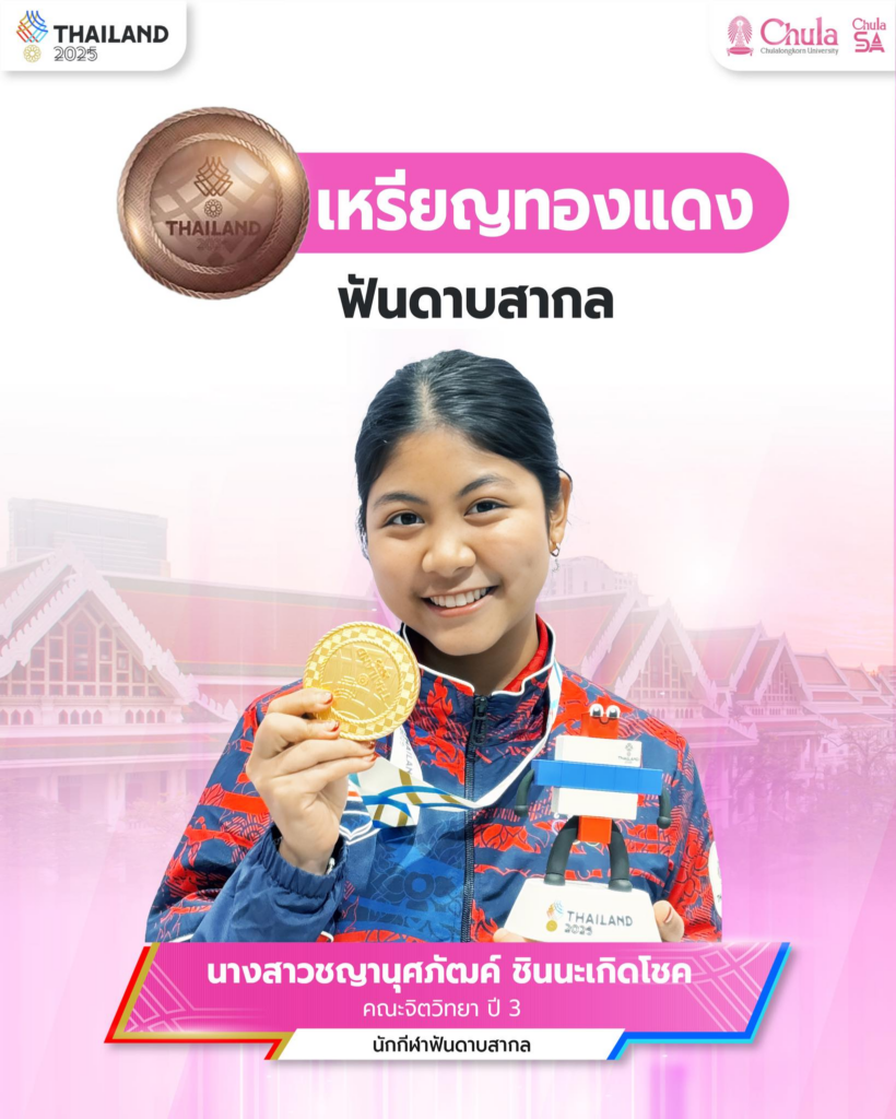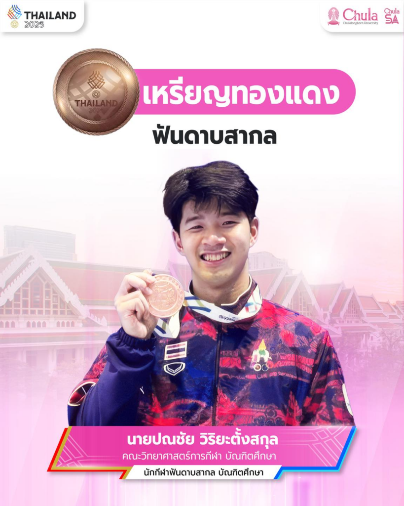 นิสิตนักกีฬาจากจุฬาลงกรณ์มหาวิทยาลัยสร้างชื่อเสียงและความภาคภูมิใจให้ประเทศไทยและมหาวิทยาลัย คว้าเหรียญทอง เหรียญเงิน และเหรียญทองแดงจากกีฬาหลากหลายประเภท ในการแข่งขันกีฬาซีเกมส์ 2025 ซึ่งประเทศไทยเป็นเจ้าภาพ ระหว่างวันที่ 9 – 20 ธันวาคม 2568