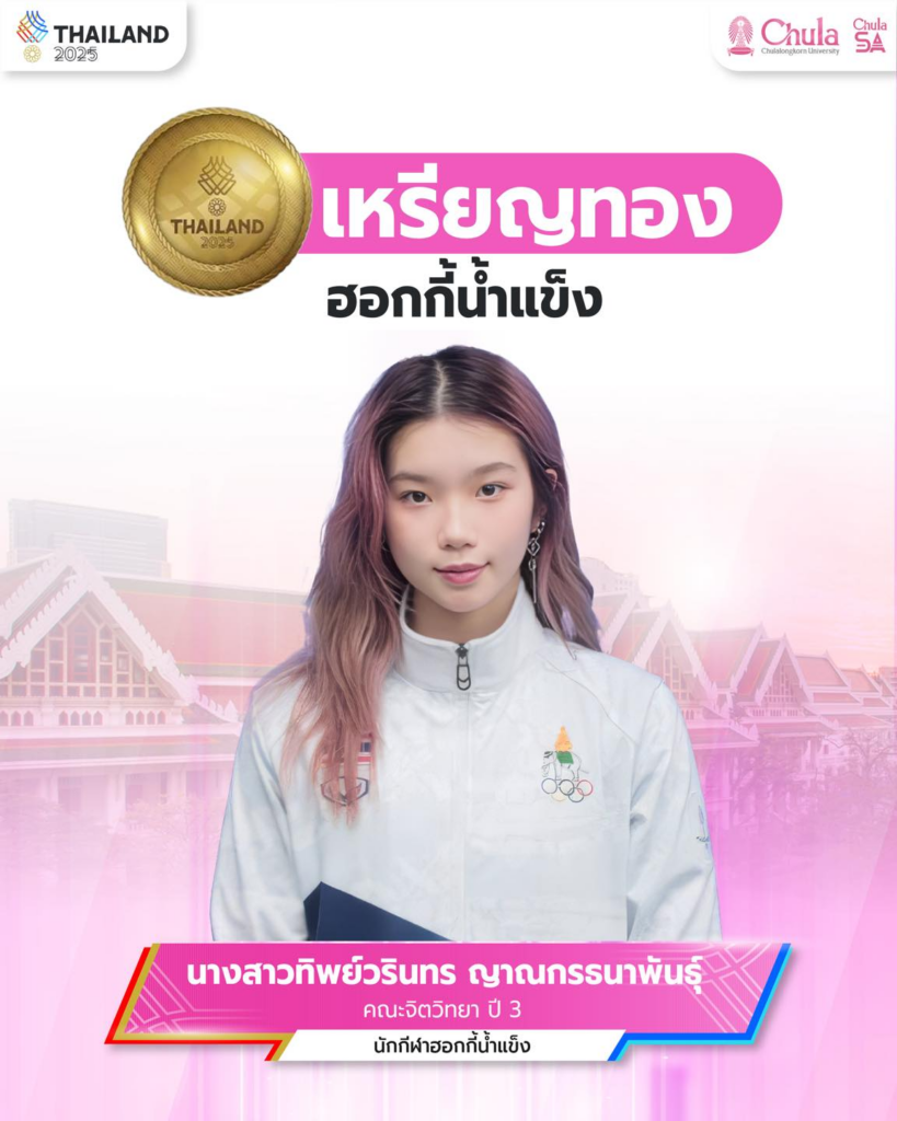 นางสาวทิพย์วรินทร ญาณกรธนาพันธุ์ นิสิตคณะจิตวิทยา ชั้นปีที่ 3ในกีฬาฮอกกี้น้ำแข็ง ประเภท Women’s Team