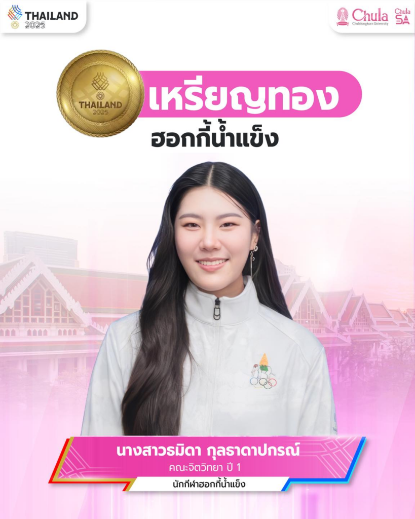 นางสาวธมิดา กุลธาดาปกรณ์ นิสิตคณะจิตวิทยา ชั้นปีที่ 1ในกีฬาฮอกกี้น้ำแข็ง ประเภท Women’s Team