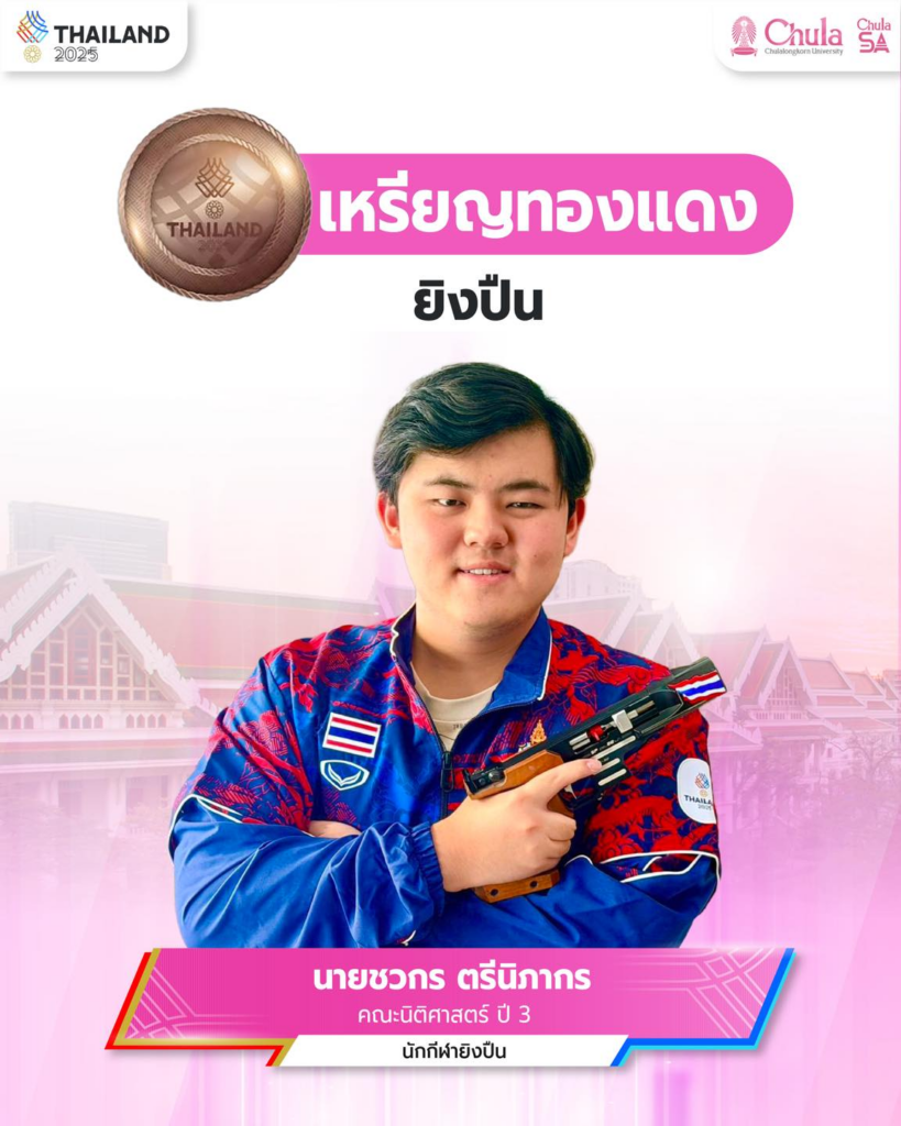 นายชวกร ตรีนิภากร นิสิตคณะนิติศาสตร์ ชั้นปีที่ 3ในกีฬายิงปืน ประเภท Men’s 25m Rapid Fire Pistol team