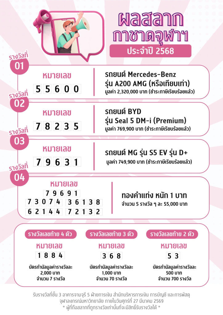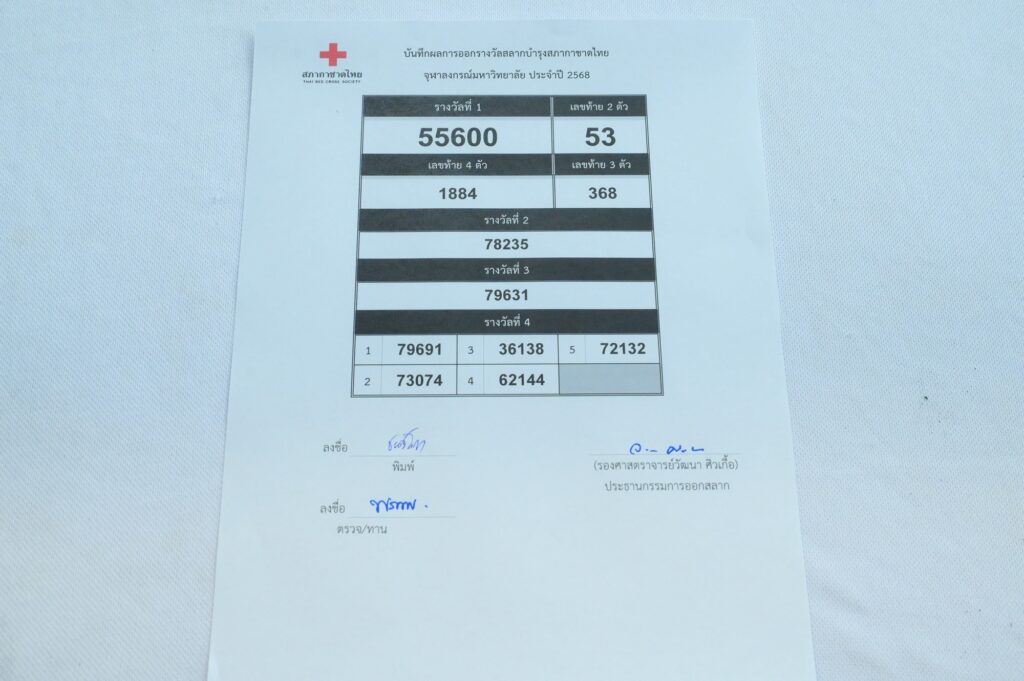 ผลการออกสลากกาชาดจุฬาฯ ประจำปี 2568 วันอาทิตย์ที่ 22 ธันวาคม 2568 เวลา 19.45 น. ณ ห้องสมุดประชาชน สวนลุมพินี
