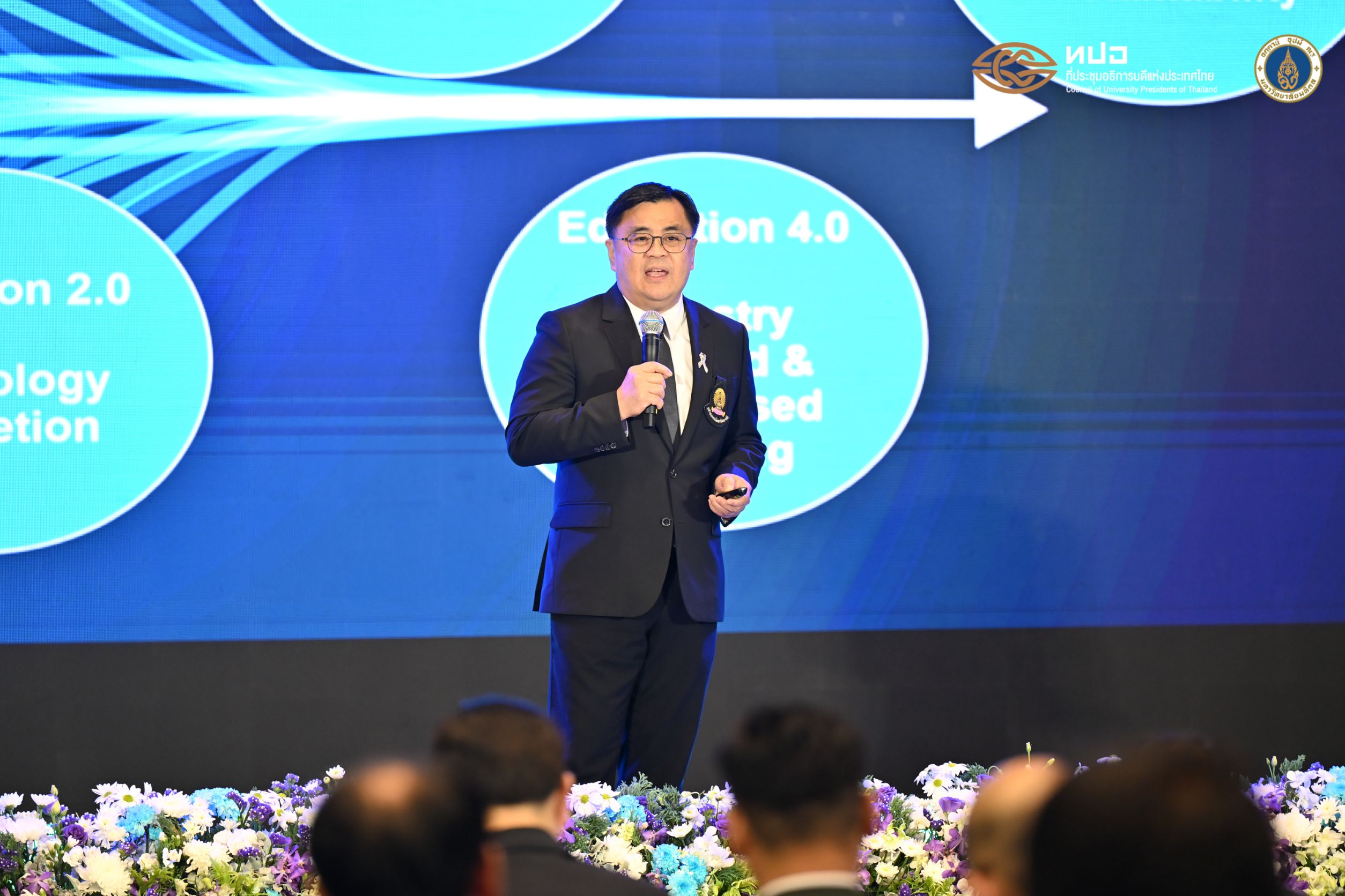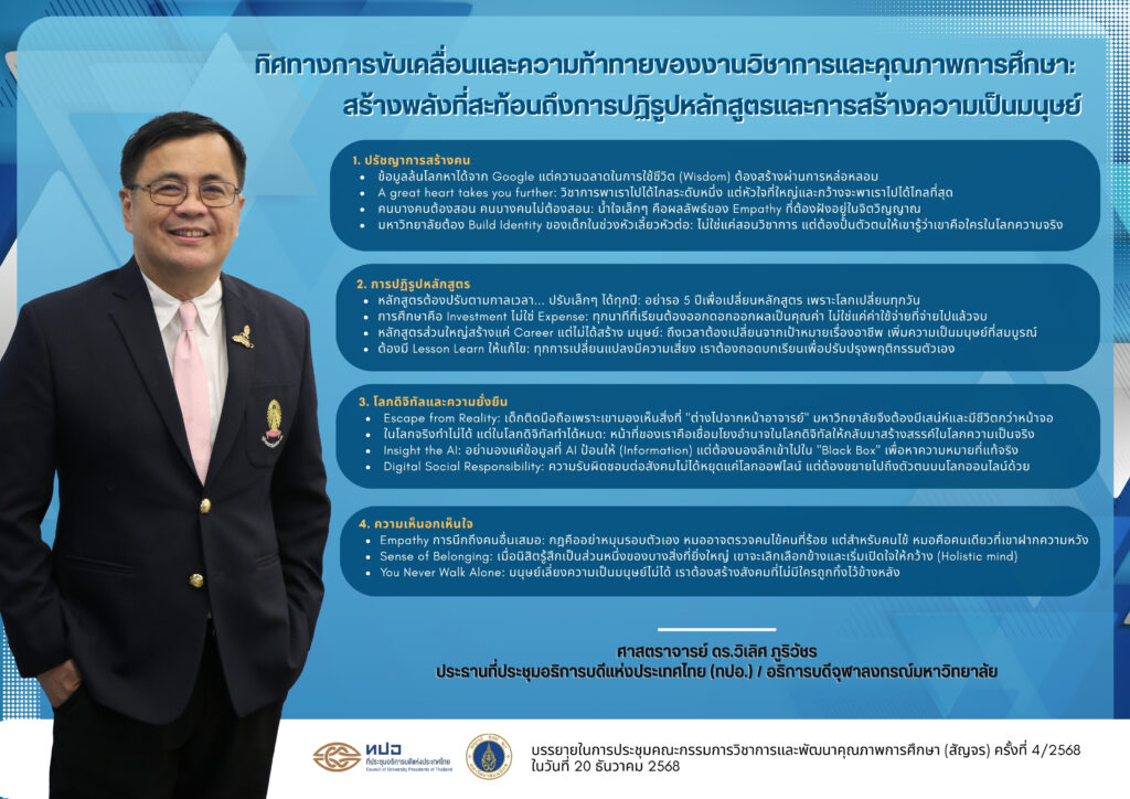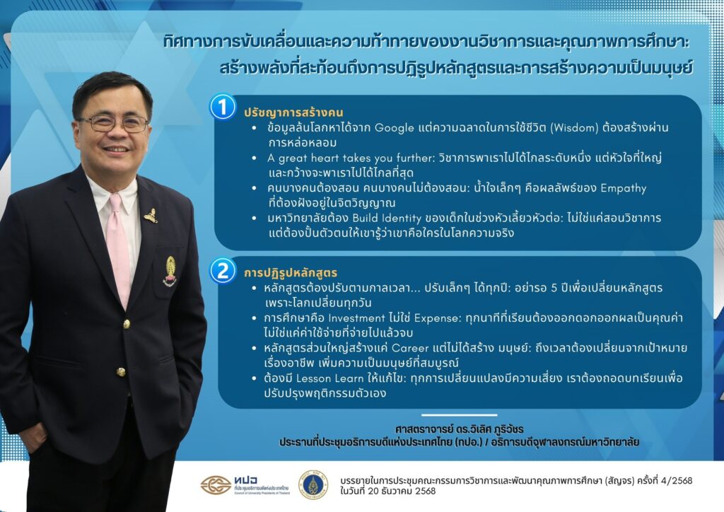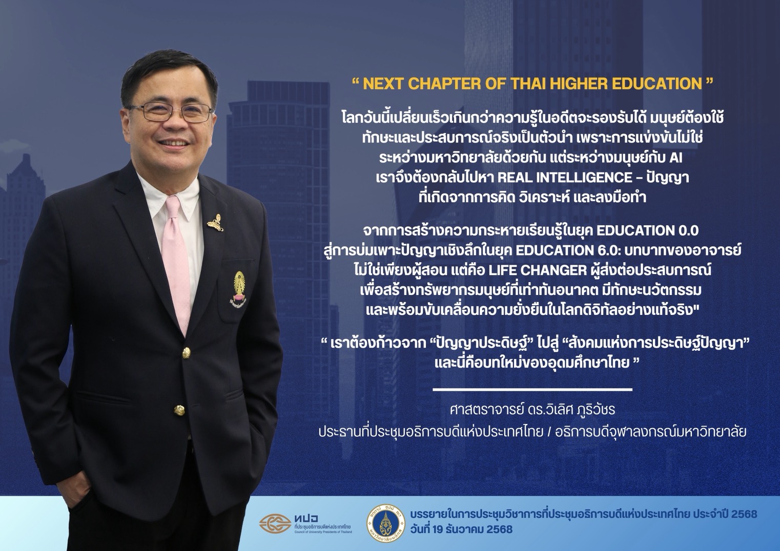 ศ.ดร.วิเลิศ ภูริวัชร อธิการบดีจุฬาฯ ประธานที่ประชุมอธิการบดีแห่งประเทศไทย (ทปอ.) บรรยายพิเศษในหัวข้อ “ก้าวต่อไปของอุดมศึกษาไทย ถอดบทเรียนและกำหนดทิศทางการศึกษาไทย” เมื่อวันที่ 19 ธันวาคม 2568 ณ โรงแรมอีสติน แกรนด์ พญาไท ในการประชุมคณะกรรมการวิชาการและพัฒนาคุณภาพการศึกษา (สัญจร) ครั้งที่ 4/2568 “Beyond AI: การบูรณาการเทคโนโลยีอย่างยั่งยืนในอุดมศึกษาไทย” (Higher Education 6.0: Building Sustainable Learning Ecosystems in the Digital Age) จัดโดยที่ประชุมอธิการบดีแห่งประเทศไทย (ทปอ.) ร่วมกับมหาวิทยาลัยมหิดล โดยมี ศ.นพ.ปิยะมิตร ศรีธรา อธิการบดีมหาวิทยาลัยมหิดล เป็นประธานเปิดการประชุม มีอธิการบดี ผู้บริหารสถาบันอุดมศึกษา และผู้แทนจากมหาวิทยาลัยต่าง ๆ เข้าร่วมการประชุมวิชาการครั้งนี้