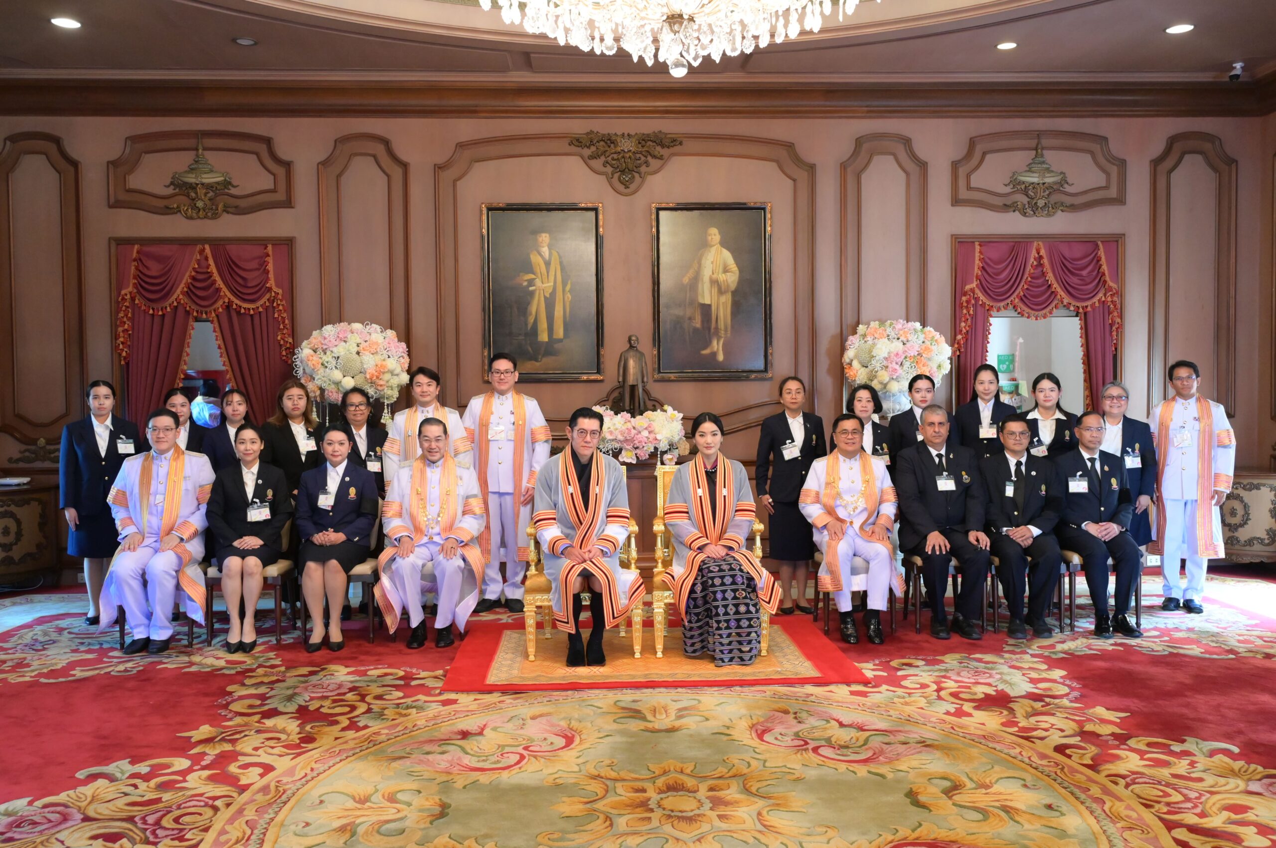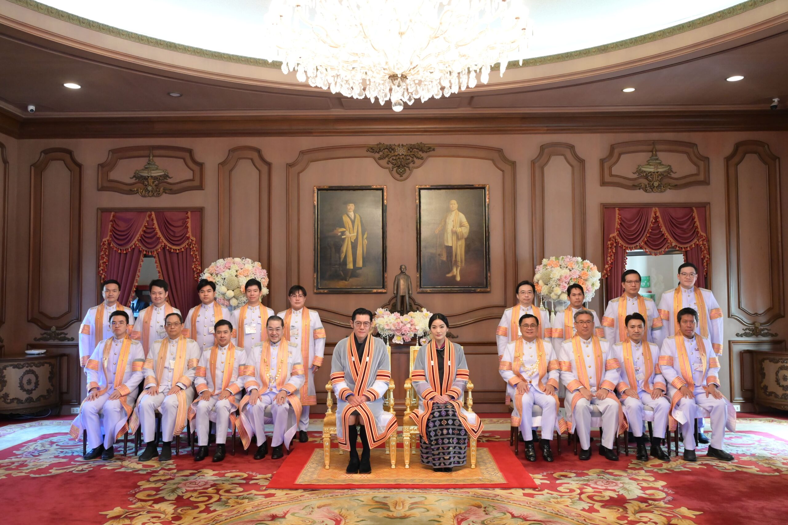 สมเด็จพระราชาธิบดีจิกมี เคเซอร์ นัมเกล วังชุก และสมเด็จพระราชินี เจตซุน เพมา วังชุก ทรงฉายพระฉายาลักษณ์ร่วมกับกรรมการสภามหาวิทยาลัยและผู้บริหารมหาวิทยาลัย ณ ห้องรับรอง หอประชุมจุฬาฯ