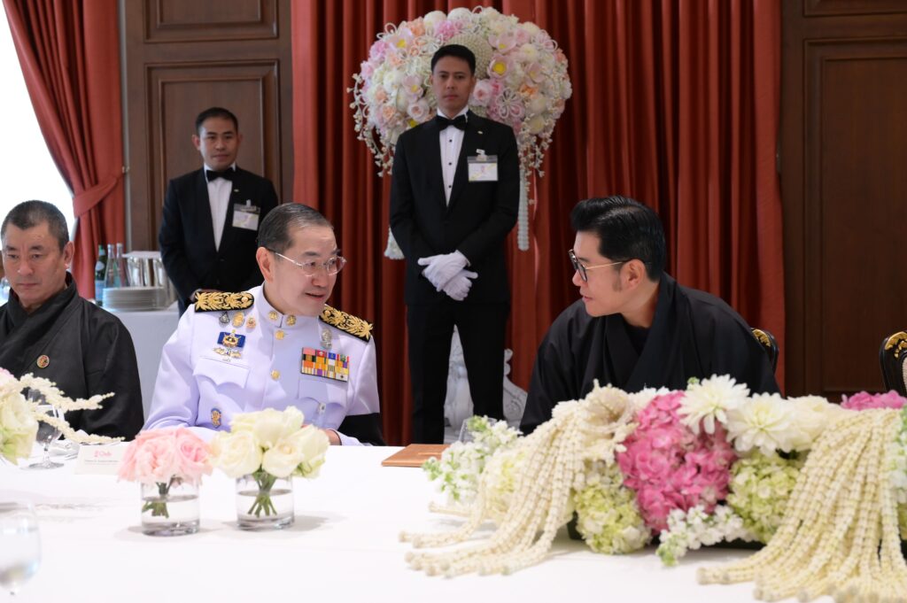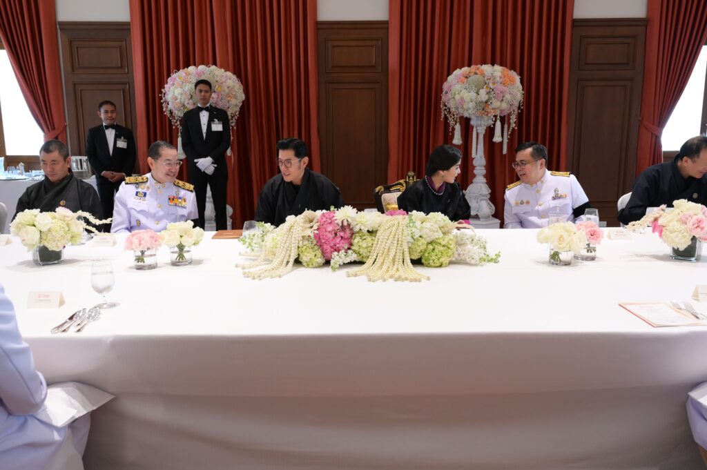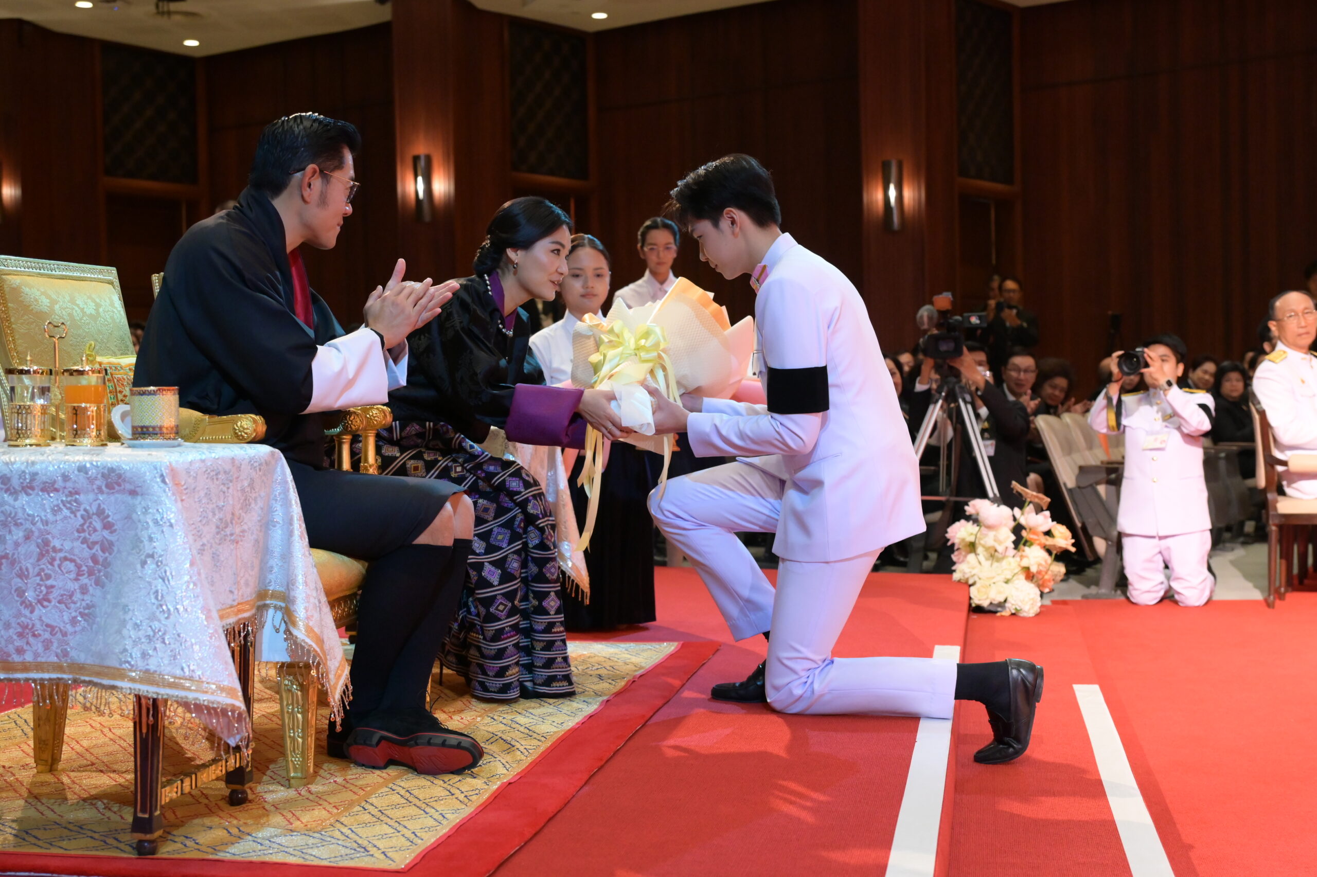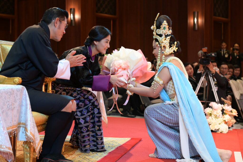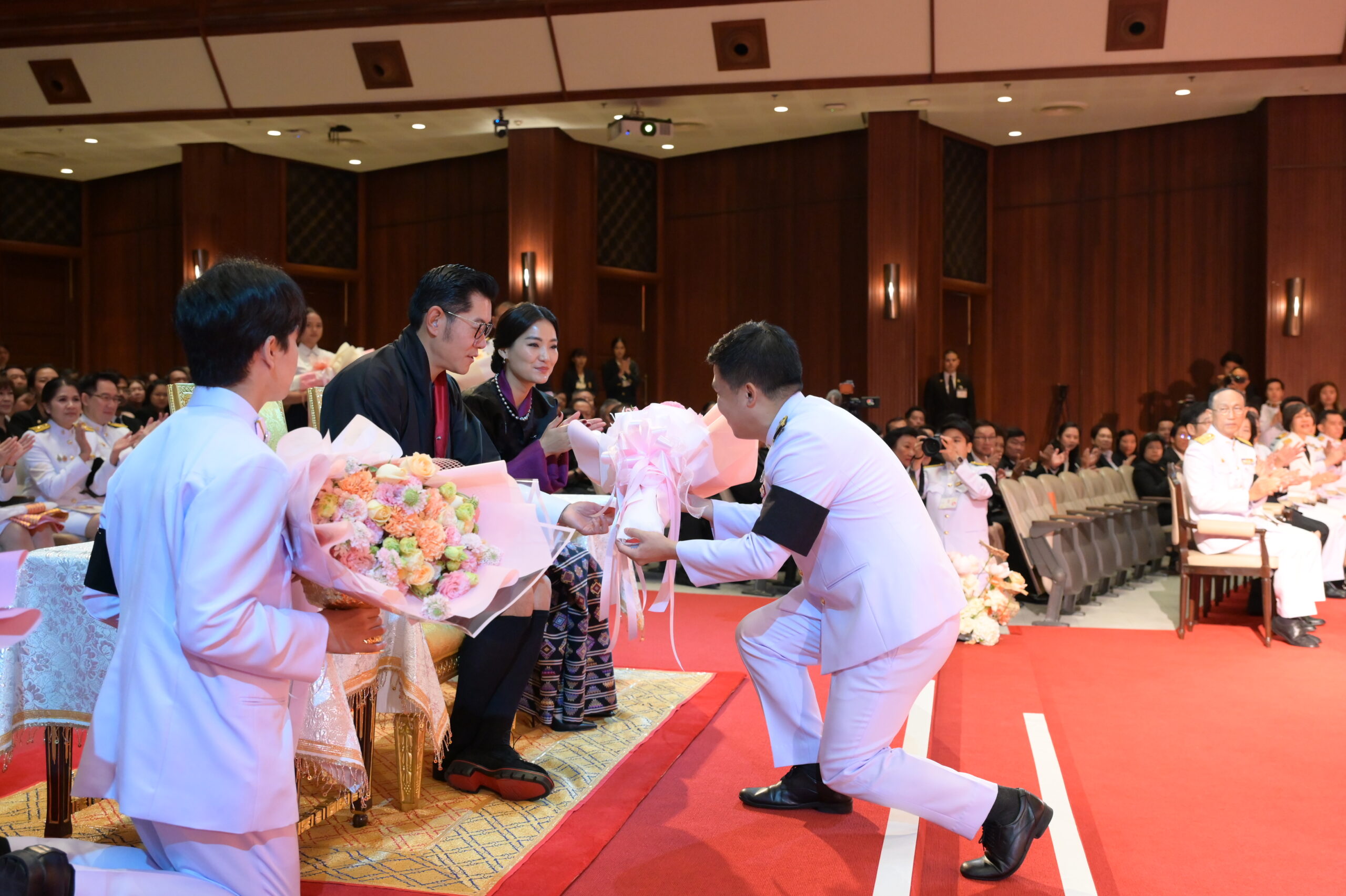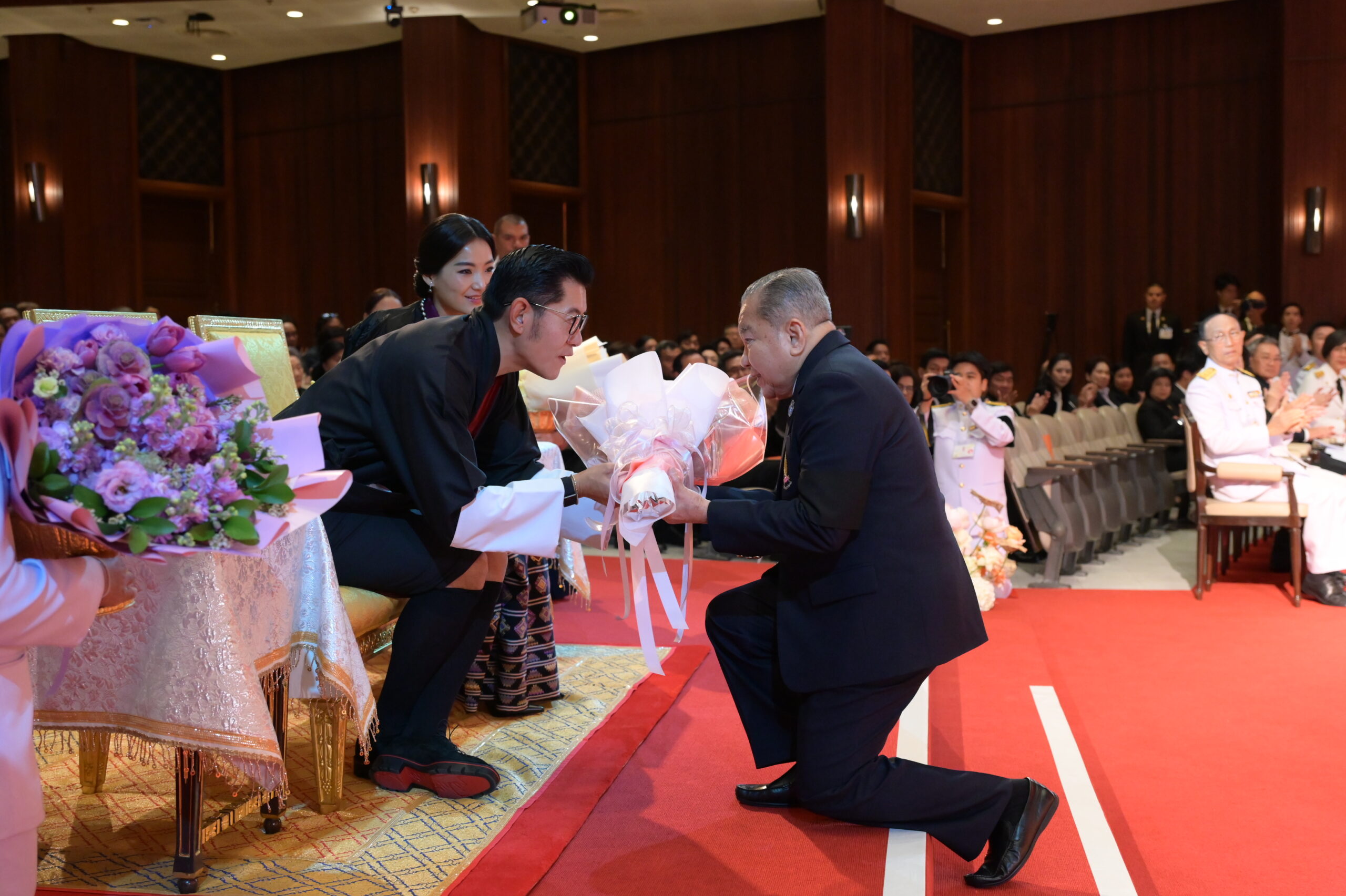 หลังจบการแสดง สมเด็จพระราชาธิบดีจิกมี เคเซอร์ นัมเกล วังชุก พระราชทานช่อดอกไม้แก่ อ.วรรธนะ ตันเจริญผล ผู้ฝึกซ้อมและอำนวยเพลง วงดุริยางค์เครื่องลมแห่งจุฬาลงกรณ์มหาวิทยาลัย และวงนักร้องประสานเสียง สโมสรนิสิตจุฬาฯ ดร.สิริชัยชาญ ฟักจำรูญ ศิลปินแห่งชาติ ผู้ฝึกซ้อมและปรับวงมหาดุริยางค์ไทยเยาวชนแห่งจุฬาลงกรณ์มหาวิทยาลัย (ChulaThaiYo) และวงดุริยางค์เครื่องลมแห่งจุฬาลงกรณ์มหาวิทยาลัย และ รศ.ดร.ยุทธนา ฉัพพรรณรัตน์ รองอธิการบดี ผู้ประพันธ์เรียบเรียงเพลง “รัตนบริบาลร่มเย็นมาช้านานทั้ง 2 แผ่นดิน” และปรับวงมหาดุริยางค์ไทยเยาวชนแห่งจุฬาลงกรณ์มหาวิทยาลัย (ChulaThaiYO) สมเด็จพระราชินี เจตซุน เพมา วังชุก พระราชทานช่อดอกไม้แก่นายกิตติพัชญ์ ตรีรัตน์ฤคเวท นิสิตคณะครุศาสตร์ จุฬาฯ ผู้แทนนักดนตรี และ น.ส.กุลนิษฐ์ เชี่ยวสกุล นิสิตคณะศิลปกรรมศาสตร์ จุฬาฯ ผู้แทนนักแสดง