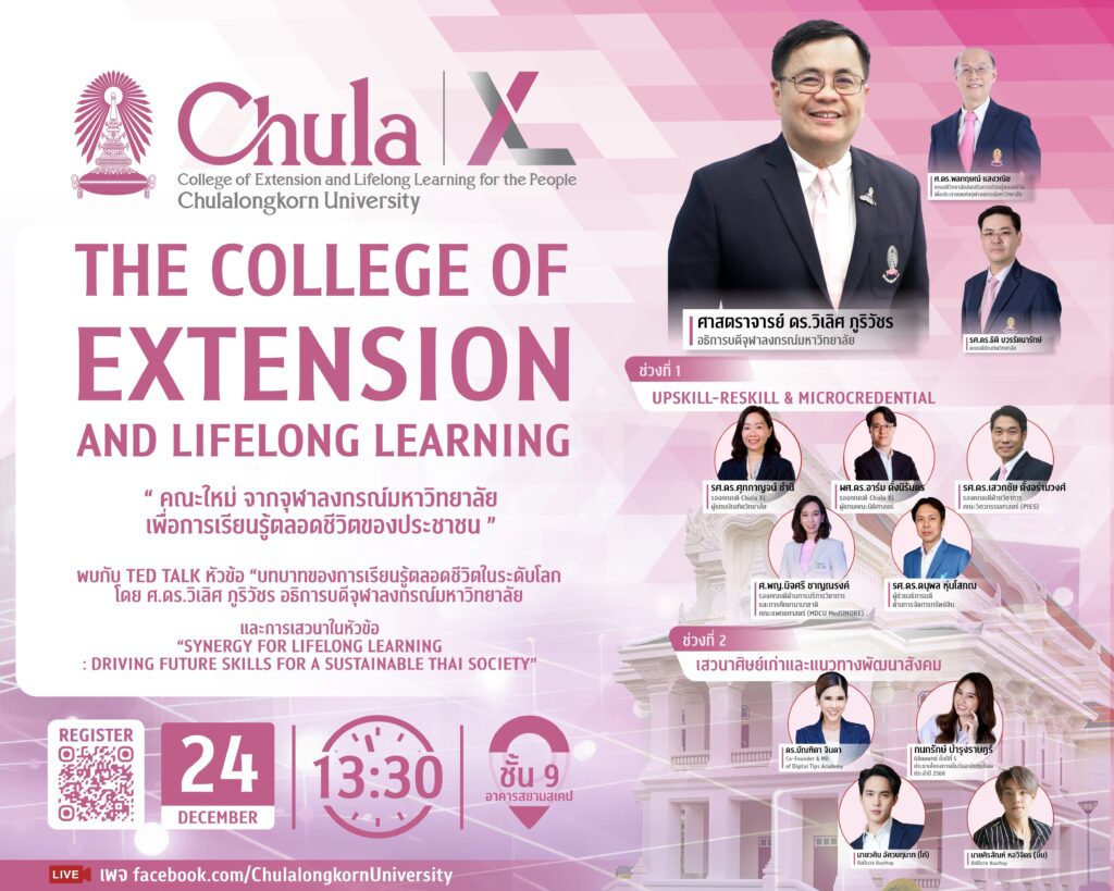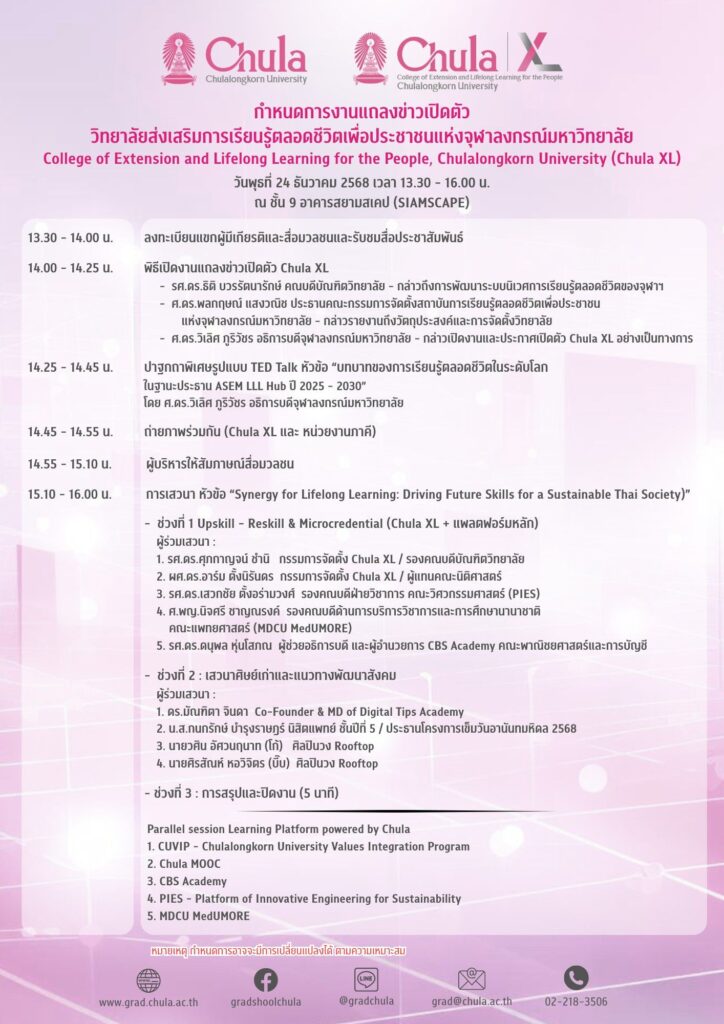 จุฬาลงกรณ์มหาวิทยาลัยจัดตั้ง “วิทยาลัยส่งเสริมการเรียนรู้ตลอดชีวิตเพื่อประชาชนแห่งจุฬาลงกรณ์มหาวิทยาลัย” (Chula XL) ซึ่งเป็นคณะใหม่ของจุฬาลงกรณ์มหาวิทยาลัย เพื่อทำหน้าที่เป็นกลไกหลักในการเชื่อมโยงองค์ความรู้ของมหาวิทยาลัยสู่ประชาชนทุกช่วงวัยอย่างเป็นรูปธรรม โดยจะจัดงานแถลงข่าวเปิดตัว Chula XL ในวันพุธที่ 24 ธันวาคม 2568 เวลา 13.00 – 16.00 น. ณ ชั้น 9 อาคารสยามสเคป (SIAMSCAPE) โดยมี ศ.ดร.วิเลิศ ภูริวัชร อธิการบดีจุฬาฯ เป็นประธานกล่าวเปิดงาน เพื่อร่วมรับฟังวิสัยทัศน์ ทิศทางการดำเนินงาน และบทบาทของเครือข่ายความร่วมมือในการขับเคลื่อนการเรียนรู้ตลอดชีวิตของประเทศ