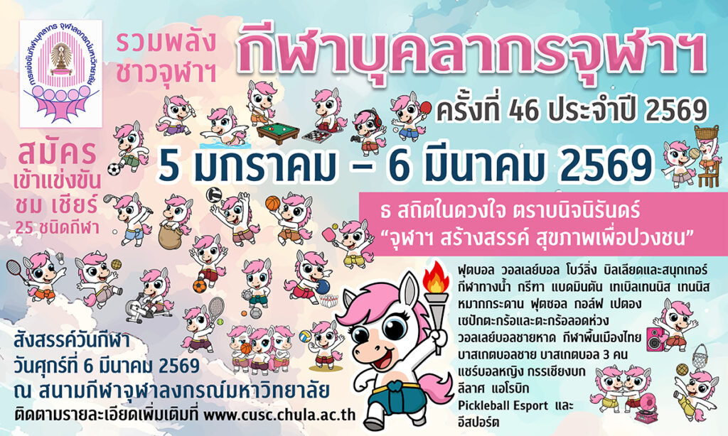 การแข่งขันกีฬาบุคลากรจุฬาฯ ครั้งที่ 46 ประจำปี 2569 มหกรรมกีฬาสำหรับชาวจุฬาฯ ภายใต้คำขวัญ “พอเพียง สามัคคี มีน้ำใจ ใฝ่ใจสุขภาพ” ได้เริ่มต้นแล้ว ระหว่างวันที่ 5 มกราคม – 6 มีนาคม 2569 โดยแนวทางการจัดการแข่งขันกีฬาบุคลากรจุฬาฯ ในปีนี้คือ “ธ สถิตในดวงใจ ตราบนิรันดร์ จุฬาฯ สร้างสรรค์ สุขภาพเพื่อปวงชน”