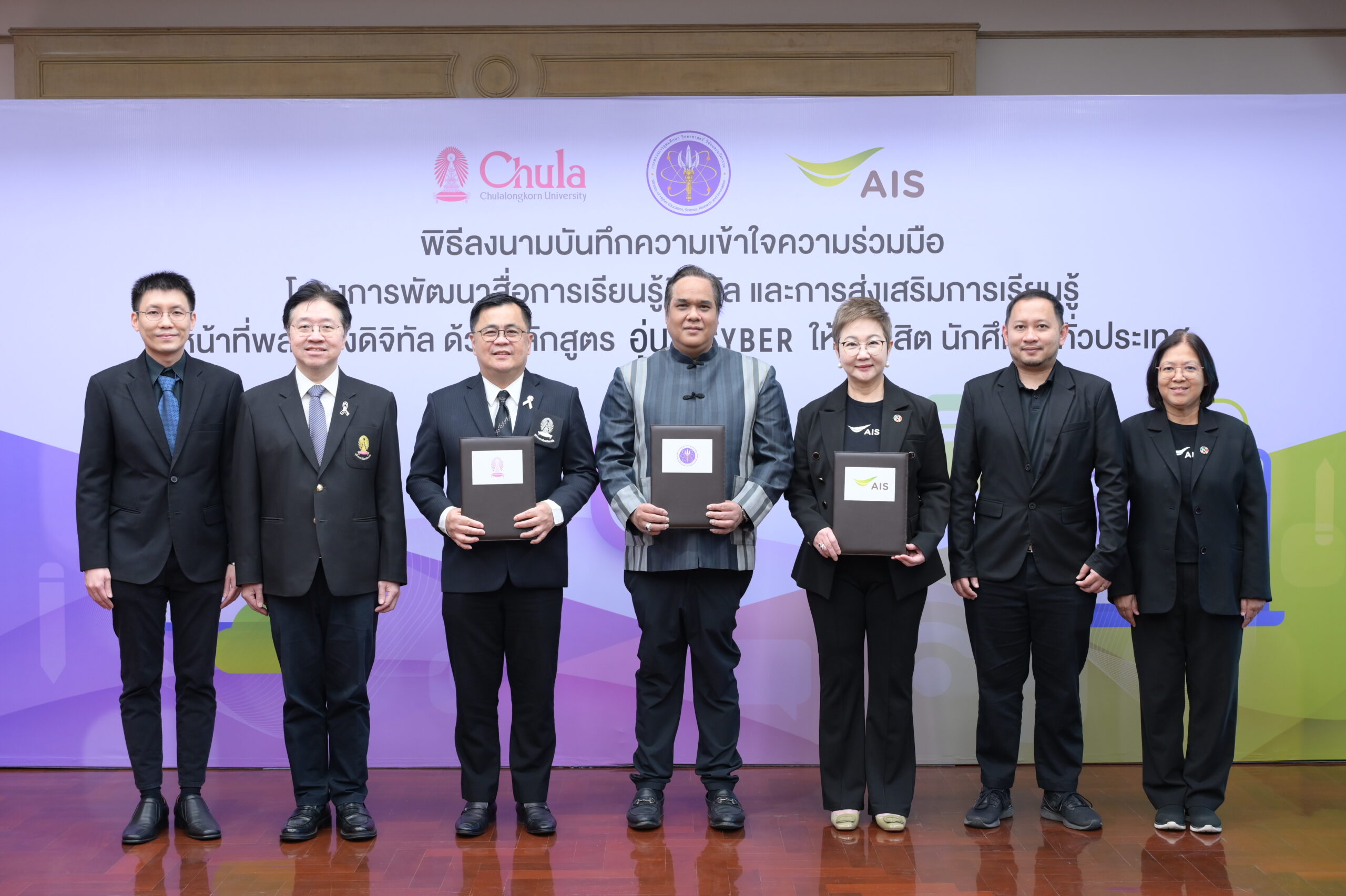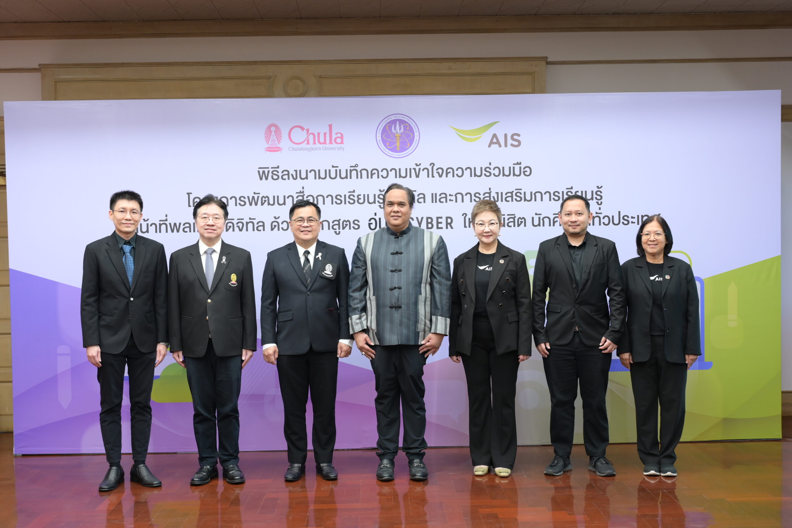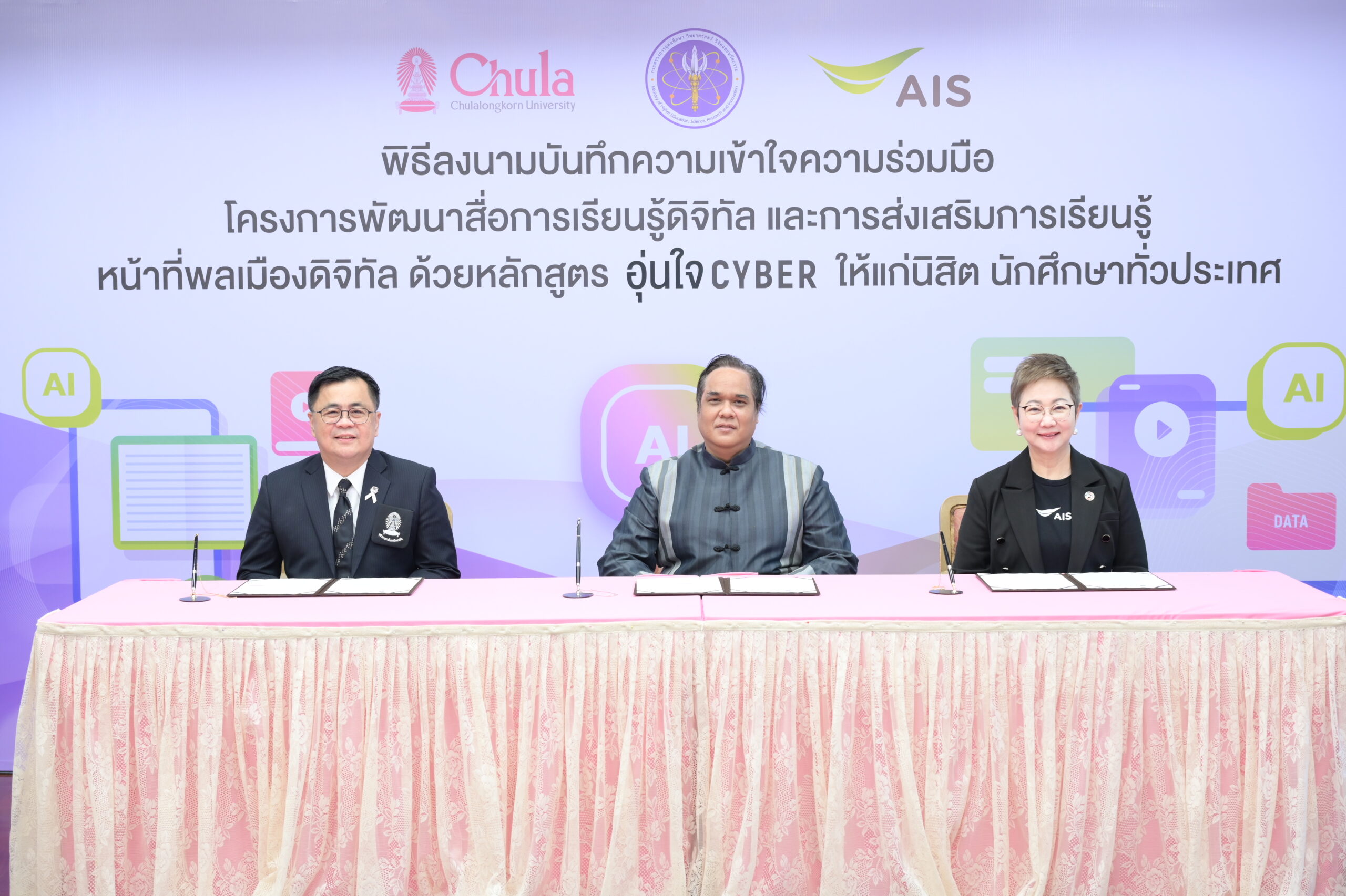 พิธีลงนามบันทึกความเข้าใจความร่วมมือการดำเนินโครงการพัฒนาสื่อการเรียนรู้ดิจิทัลและการส่งเสริมการเรียนรู้หน้าที่พลเมืองดิจิทัลด้วยหลักสูตร “อุ่นใจไซเบอร์” ให้แก่นิสิตนักศึกษาทั่วประเทศ ระหว่างสำนักงานปลัดกระทรวงการอุดมศึกษา วิทยาศาสตร์ วิจัยและนวัตกรรม จุฬาลงกรณ์มหาวิทยาลัย และบริษัท แอดวานซ์ ไวร์เลส เน็ทเวอร์ค จำกัด จัดขึ้นเมื่อวันศุกร์ที่ 26 ธันวาคม 2568 ณ ห้องรับรอง หอประชุมจุฬาฯ โดยมี ศ.ดร.วิเลิศ ภูริวัชร อธิการบดีจุฬาลงกรณ์มหาวิทยาลัย ดร.พันธุ์เพิ่มศักดิ์ อารุณี ผู้ช่วยปลัดกระทรวงการอุดมศึกษา วิทยาศาสตร์ วิจัยและนวัตกรรม รักษาราชการแทนรองปลัดกระทรวง อว. และคุณสายชล ทรัพย์มากอุดม หัวหน้าคณะผู้บริหารด้านสื่อสารองค์กรและรัฐกิจสัมพันธ์ เอไอเอส ร่วมพิธีลงนามบันทึกข้อตกลงความร่วมมือในครั้งนี้