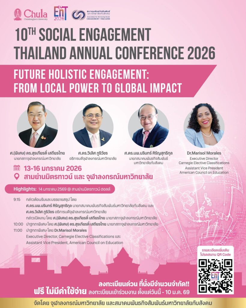 จุฬาลงกรณ์มหาวิทยาลัย ร่วมกับสมาคมพันธกิจสัมพันธ์มหาวิทยาลัยกับสังคม ขอเชิญชวนผู้สนใจเข้าร่วมงานประชุมวิชาการระดับชาติ Engagement Thailand ครั้งที่ 10 “10TH SOCIAL ENGAGEMENT THAILAND ANNUAL CONFERENCE 2026” ในหัวข้อ FUTURE HOLISTIC ENGAGEMENT: FROM LOCAL POWER TO GLOBAL IMPACT ระหว่างวันที่ 13-16 มกราคม 2569 ณ สามย่านมิตรทาวน์ และจุฬาลงกรณ์มหาวิทยาลัย