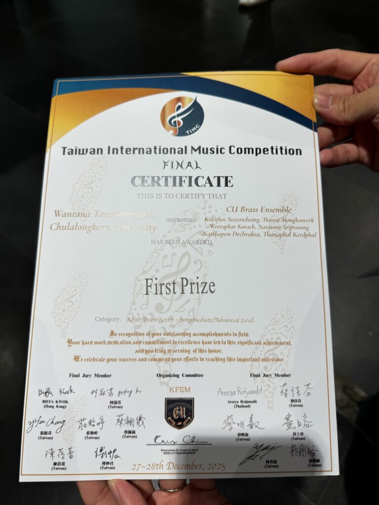 จุฬาลงกรณ์มหาวิทยาลัยขอแสดงความยินดีกับวง CU Brass Ensemble วงดนตรีในการดำเนินงานของสำนักบริหารศิลปวัฒนธรรม จุฬาลงกรณ์มหาวิทยาลัย ซึ่งประกอบด้วยนิสิตและคณาจารย์จากคณะครุศาสตร์ จุฬาฯ ที่ร่วมกันสร้างผลงานคุณภาพระดับสากล คว้ารางวัล First Prize (รางวัลชนะเลิศ) จากเวทีการแข่งขันดนตรีระดับนานาชาติ Taiwan International Music Competition 2025 (รอบ Final) ซึ่งจัดขึ้นระหว่างวันที่ 27–28 ธันวาคม 2568 ณ กรุงไทเป สาธารณรัฐจีน (ไต้หวัน)