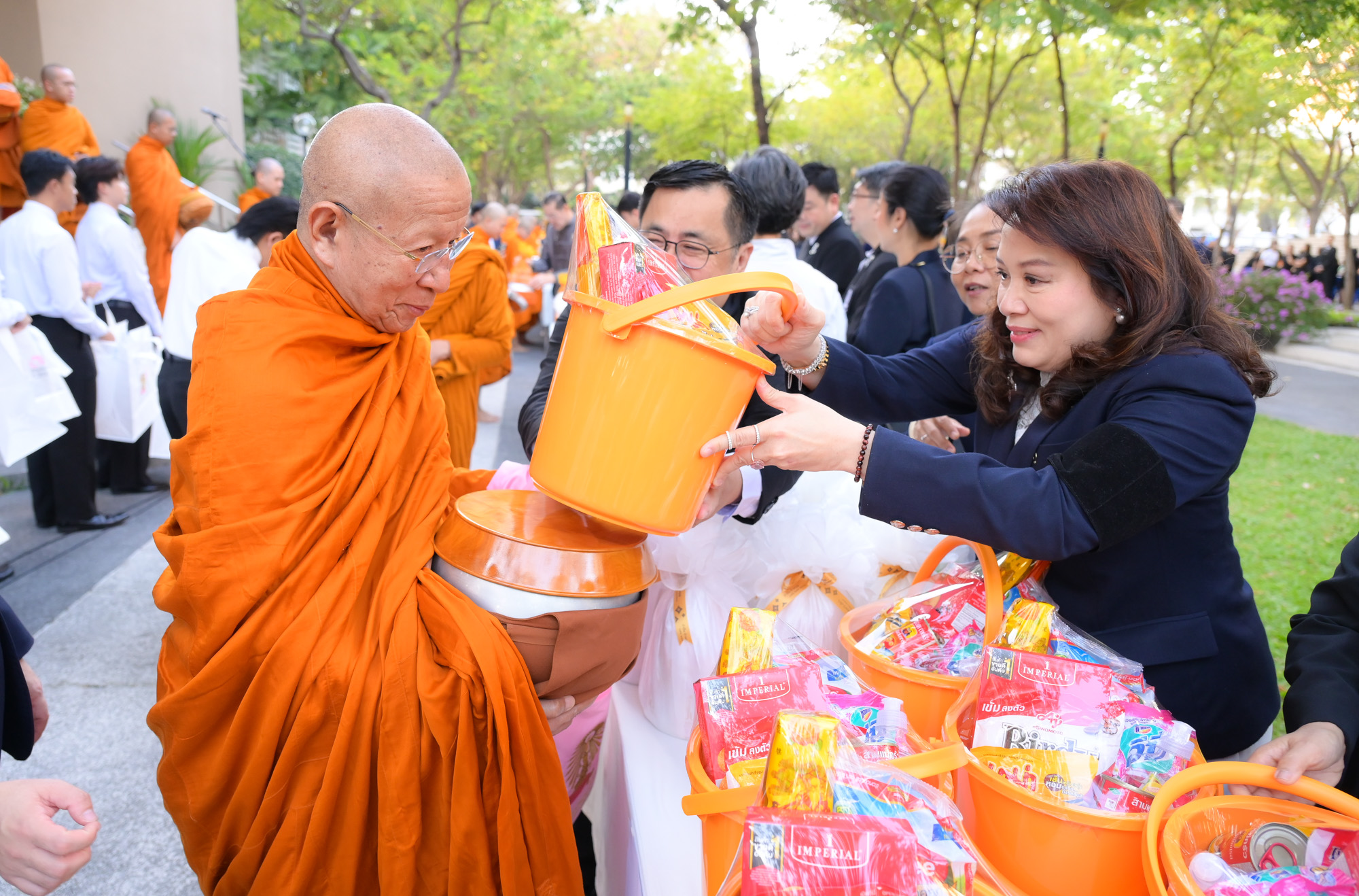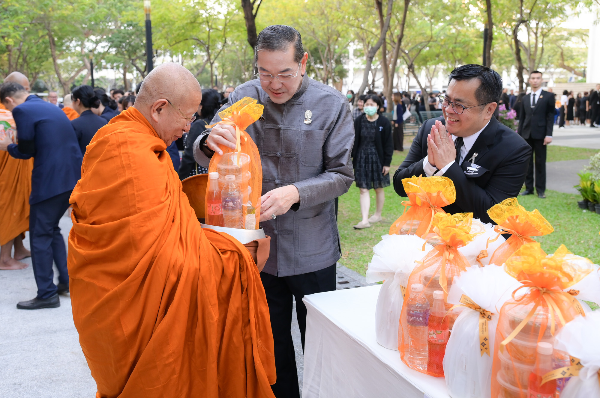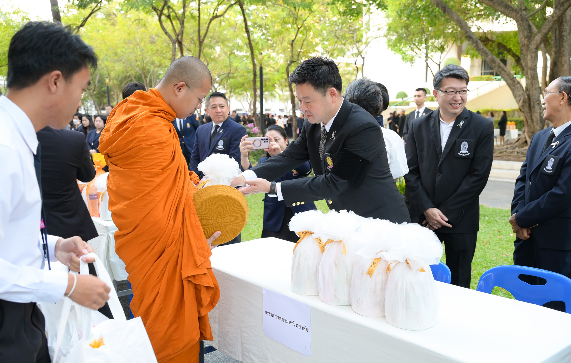 ในโอกาสนี้ ศ. (พิเศษ) ดร.สุรเกียรติ์ เสถียรไทย นายกสภาจุฬาฯ ศ.ดร.วิเลิศ ภูริวัชร อธิการบดีจุฬาฯ กรรมการสภามหาวิทยาลัย ผู้บริหารมหาวิทยาลัย ที่ปรึกษาอธิการบดี คณบดี ผู้อำนวยการสถาบัน สำนักงาน ศูนย์ สำนัก พร้อมด้วยบุคลากรและนิสิตร่วมตักบาตรพระสงฆ์จำนวน 36 รูปจากวัดปทุมวนาราม ราชวรวิหาร ภายหลังพิธีตักบาตร นายกสภามหาวิทยาลัยและอธิการบดีจุฬาฯ ได้ให้โอวาทและอวยพรปีใหม่แก่ชาวจุฬาฯ จากนั้นผู้ร่วมพิธีรับประทานอาหารเช้าร่วมกัน ณ บริเวณอาคารจามจุรี 3 และอาคารจามจุรี 4