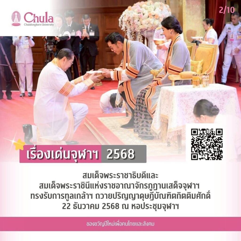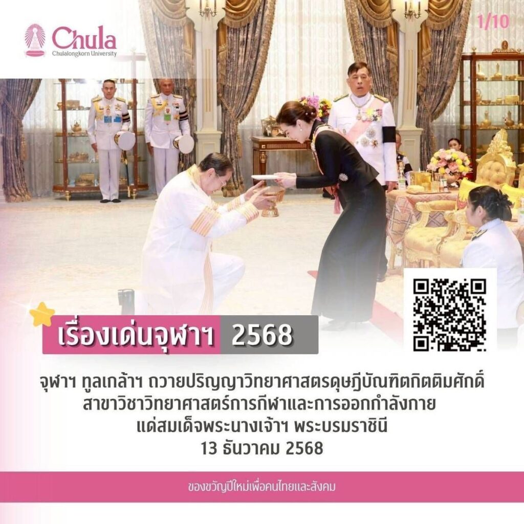 1. จุฬาฯ ทูลเกล้าฯ ถวายปริญญาวิทยาศาสตรดุษฎีบัณฑิตกิตติมศักดิ์สาขาวิชาวิทยาศาสตร์การกีฬา และการออกกำลังกายแด่สมเด็จพระนางเจ้าฯ พระบรมราชินี 13 ธันวาคม 2568 ณ พระที่นั่งอัมพรสถาน พระราชวังดุสิต