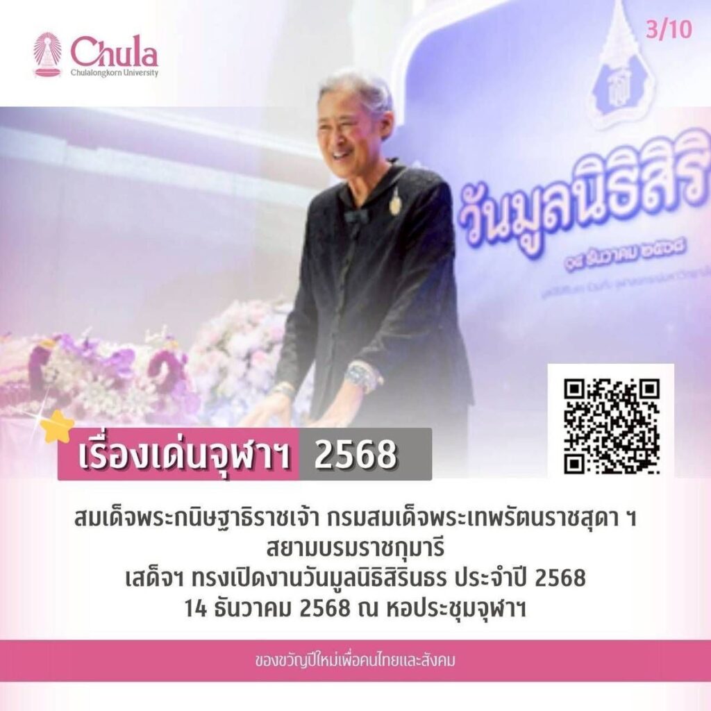 3. สมเด็จพระกนิษฐาธิราชเจ้า กรมสมเด็จพระเทพรัตนราชสุดา ฯ สยามบรมราชกุมารี เสด็จฯ ทรงเปิดงานวันมูลนิธิสิรินธร ประจำปี 2568 14 ธันวาคม 2568 ณ หอประชุมจุฬาฯ