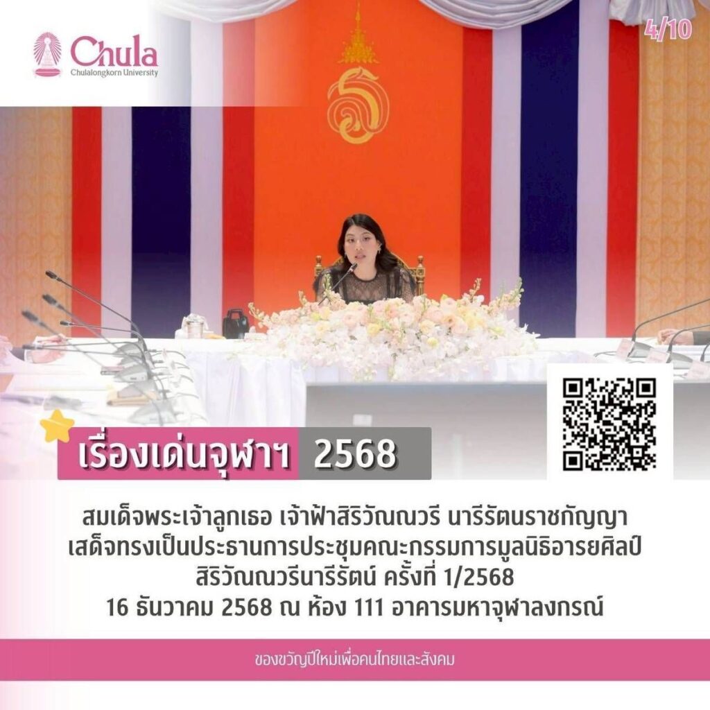 4. สมเด็จพระเจ้าลูกเธอ เจ้าฟ้าสิริวัณณวรี นารีรัตนราชกัญญาเสด็จทรงเป็นประธานการประชุมคณะกรรมการมูลนิธิอารยศิลป์ สิริวัณณวรีนารีรัตน์ ครั้งที่ 1/2568 16 ธันวาคม 2568 ณ ห้อง 111 อาคารมหาจุฬาลงกรณ์