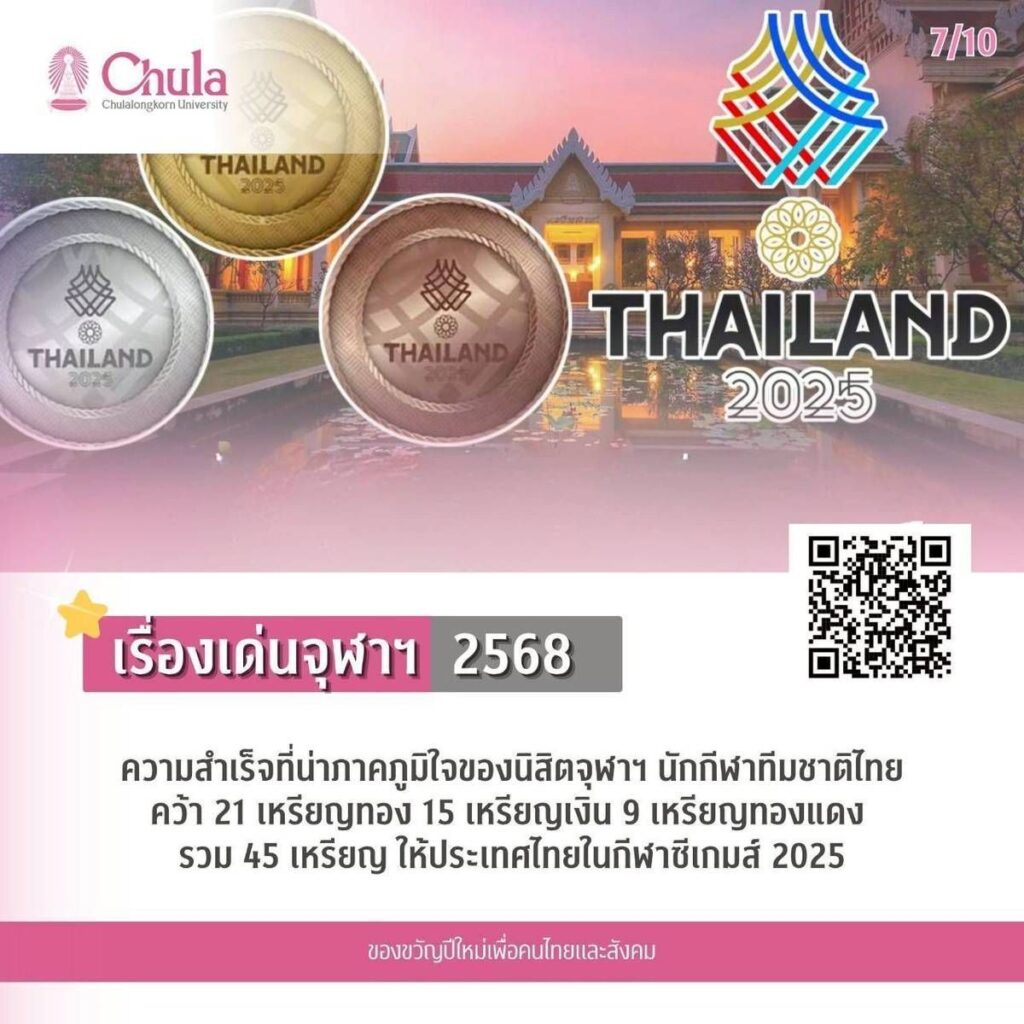 7. ความสำเร็จที่น่าภาคภูมิใจของนิสิตจุฬาฯ นักกีฬาทีมชาติไทย คว้า 21 เหรียญทอง 15 เหรียญเงิน 9 เหรียญทองแดง รวม 45 เหรียญ ให้ประเทศไทยในกีฬาซีเกมส์ 2025