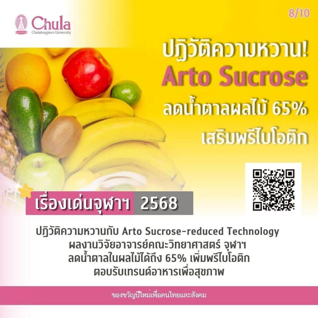8. ปฏิวัติความหวานกับ Arto Sucrose-reduced Technology ผลงานวิจัยอาจารย์คณะวิทยาศาสตร์ จุฬาฯ ลดน้ำตาลในผลไม้ได้ถึง 65% เพิ่มพรีไบโอติก ตอบรับเทรนด์อาหารเพื่อสุขภาพ