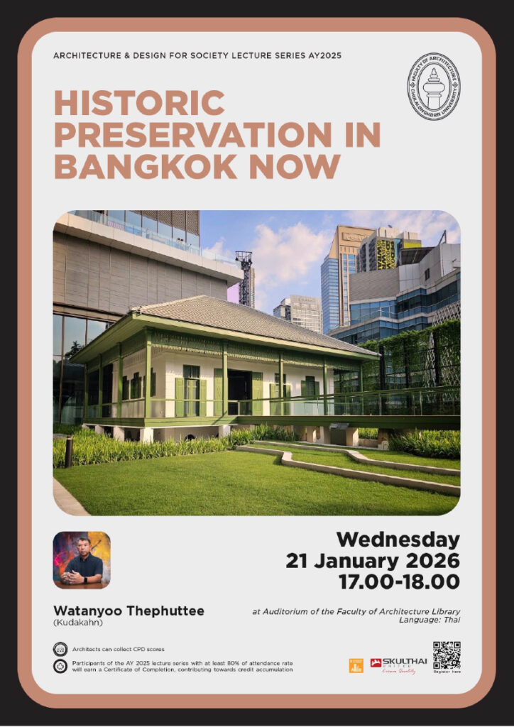 คณะสถาปัตยกรรมศาสตร์ จุฬาลงกรณ์มหาวิทยาลัยขอเชิญคณาจารย์ นิสิต บุคลากร และผู้สนใจเข้าฟังการบรรยายพิเศษทางวิชาการ Lecture Series AY 2025 ครั้งที่ 2 ในหัวข้อ “Historic Preservation in Bangkok Now” ซึ่งเป็นส่วนหนึ่งของการบรรยายภายใต้หัวข้อ “Architecture and Design for Society” ประจำปีการศึกษา 2568 ในวันพุธที่ 21 มกราคม 2569 เวลา 17.00–18.00 น. ณ ห้องออดิทอเรียม ชั้น 4 ห้องสมุดคณะสถาปัตยกรรมศาสตร์ จุฬาฯ เพื่อเปิดพื้นที่แลกเปลี่ยนองค์ความรู้ด้านสถาปัตยกรรมและการออกแบบที่เชื่อมโยงกับสังคมร่วมสมัย โดยมีคุณวทัญญู เทพหัตถี เป็นวิทยากรถ่ายทอดประสบการณ์และมุมมองเกี่ยวกับการอนุรักษ์สถาปัตยกรรมประวัติศาสตร์ในบริบทของกรุงเทพมหานครปัจจุบัน