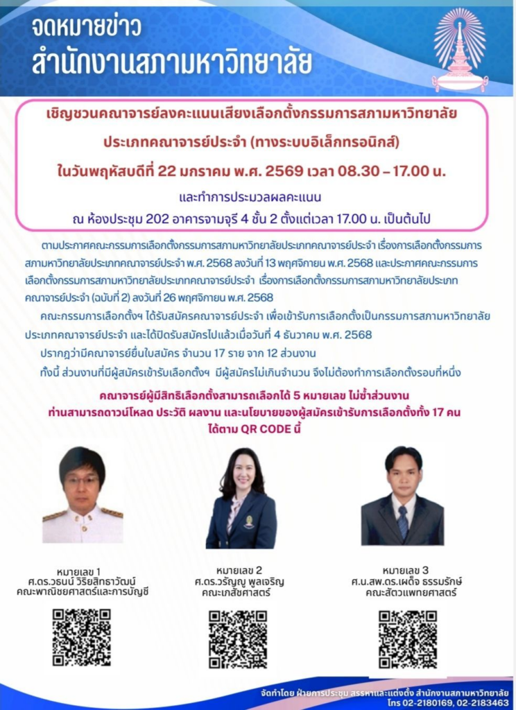 ขอเชิญคณาจารย์ประจำของจุฬาฯ ใช้สิทธิ์ลงคะแนนเสียงเลือกตั้งกรรมการสภามหาวิทยาลัยประเภทคณาจารย์ประจำที่ครบวาระ รอบที่สอง ทางระบบอิเล็กทรอนิกส์ ในวันพฤหัสบดีที่ 22 มกราคม 2569 ตั้งแต่เวลา 08.30 – 17.00 น. และประมวลผลคะแนน ณ ห้อง 202 ชั้น 2 อาคารจามจุรี 4 เวลา 17.00 น. เป็นต้นไป