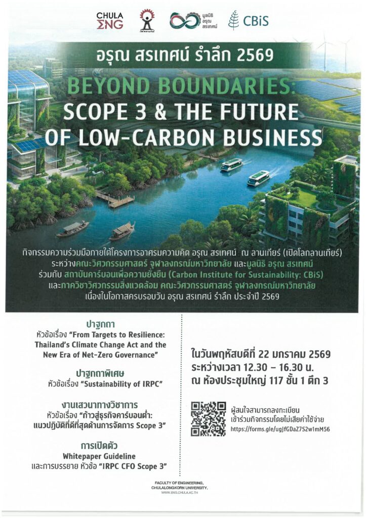 คณะวิศวกรรมศาสตร์ จุฬาลงกรณ์มหาวิทยาลัย และมูลนิธิอรุณ สรเทศน์ ภายใต้โครงการอาศรมความคิด อรุณ สรเทศน์ ณ ลานเกียร์ (เปิดโลกลานเกียร์) จัดเสวนาทางวิชาการเนื่องในโอกาสครบรอบวันอรุณ สรเทศน์ รำลึก 2569 เรื่อง “Beyond Boundaries: Scope 3 & The Future of Low-Carbon Business” ในวันพฤหัสบดีที่ 22 มกราคม 2569 เวลา 12.30 – 16.30 น. ณ หอประชุมใหญ่ ชั้น 1 ตึก 3 คณะวิศวกรรมศาสตร์ จุฬาฯ