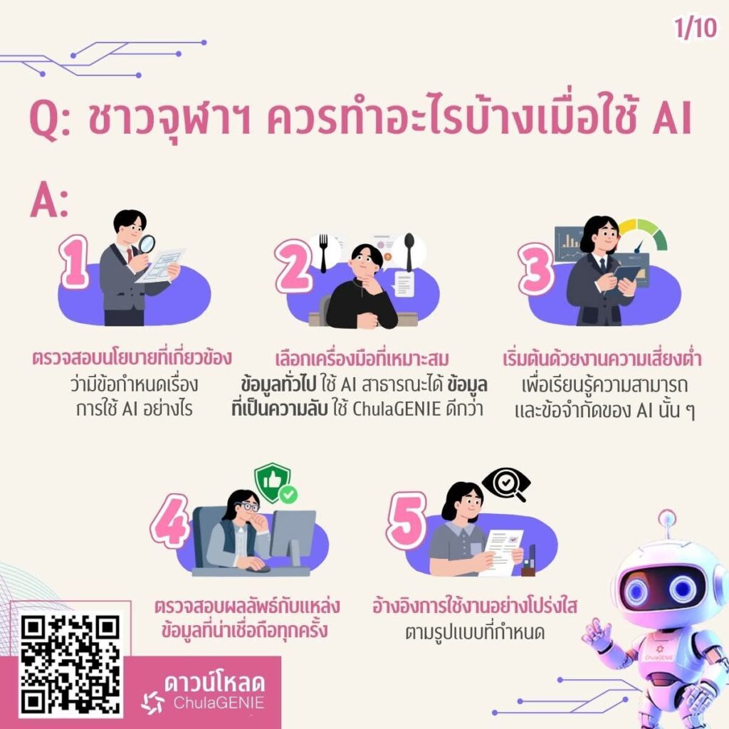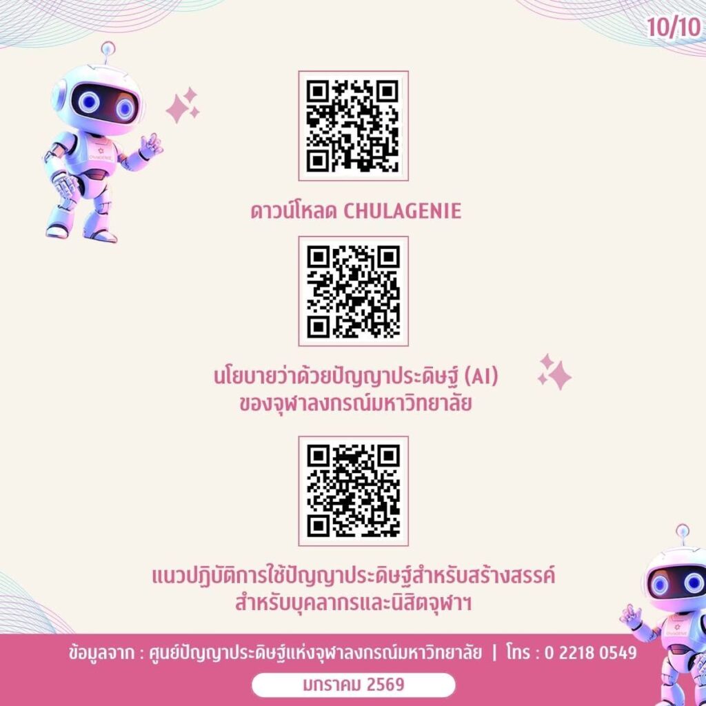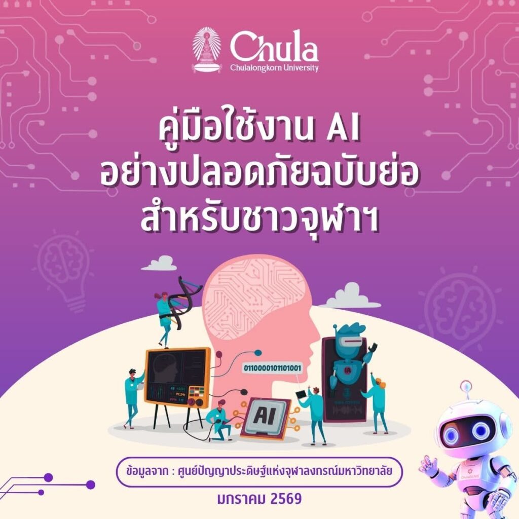 ในยุคที่ปัญญาประดิษฐ์ (AI) กลายเป็นผู้ช่วยคู่ใจในการเรียน การวิจัย และการทำงาน ชาวจุฬาฯ ควรรู้จักใช้ AI ให้ เก่ง ปลอดภัย และมีความรับผิดชอบคู่มือการใช้งาน AI อย่างปลอดภัยฉบับย่อ สรุปข้อมูลครบถ้วนเพื่อการใช้ AI สำหรับชาวจุฬาฯ – ชาวจุฬาฯ ควรทำอะไรบ้างเมื่อใช้ AI– AI ช่วยงานนิสิต นักวิจัย และบุคลากรได้อย่างไร– ข้อควรระวังที่ไม่ควรมองข้ามพร้อมแนะนำ “ChulaGENIE” AI ของจุฬาฯ ที่พัฒนาขึ้นเพื่อรองรับการทำงานภายในมหาวิทยาลัยโดยเฉพาะ อ่านให้เข้าใจ ใช้ให้ถูกต้อง แล้วเติบโตไปกับ AI อย่างมั่นใจ