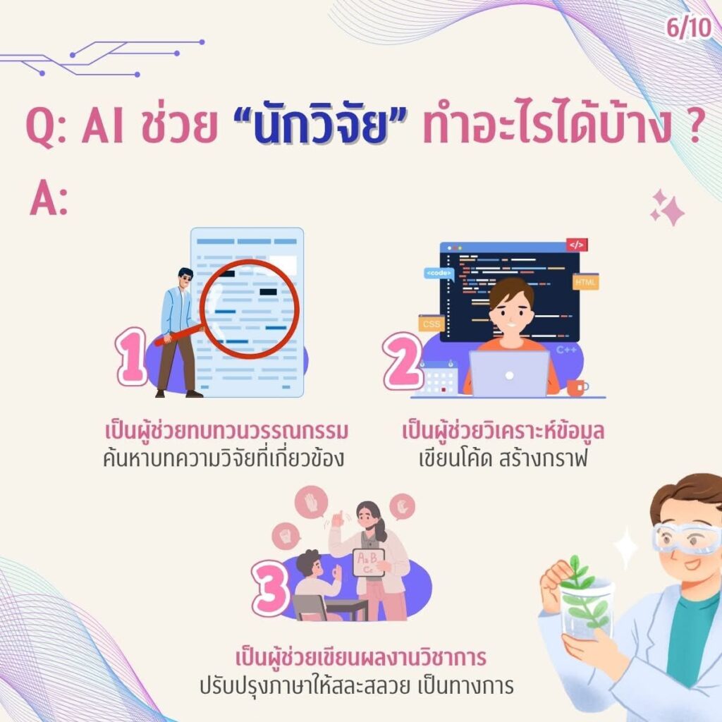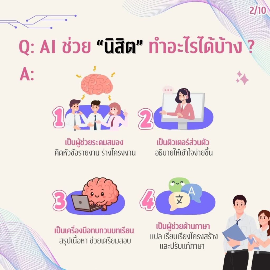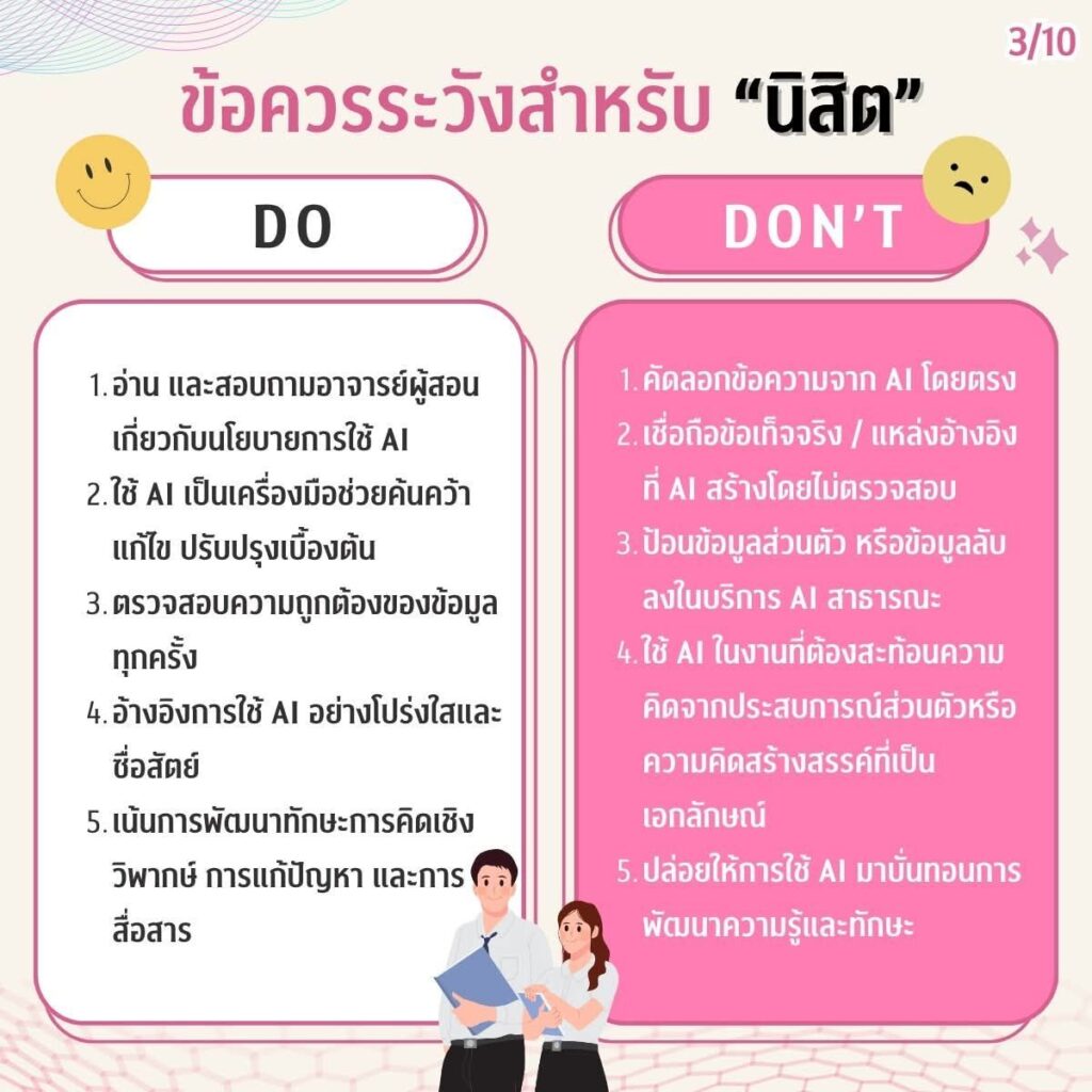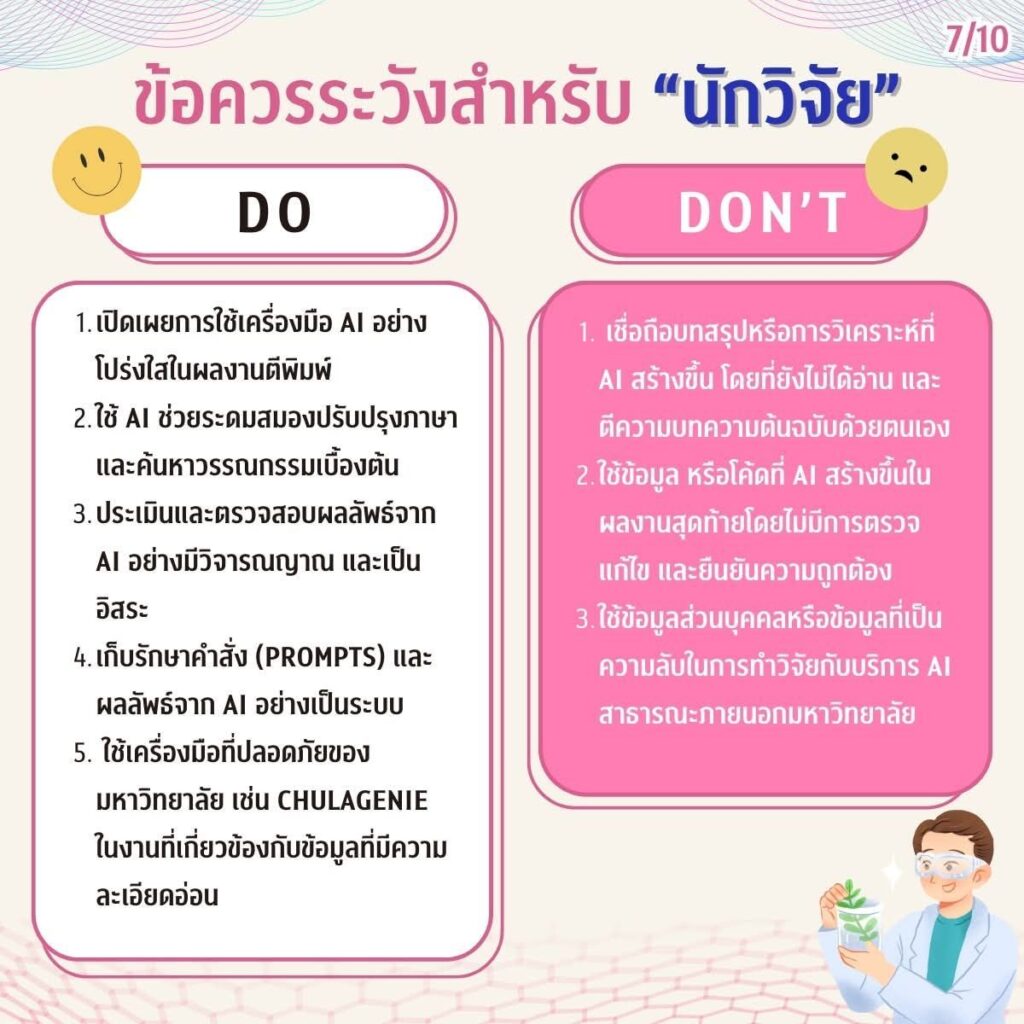 ในยุคที่ปัญญาประดิษฐ์ (AI) กลายเป็นผู้ช่วยคู่ใจในการเรียน การวิจัย และการทำงาน ชาวจุฬาฯ ควรรู้จักใช้ AI ให้ เก่ง ปลอดภัย และมีความรับผิดชอบคู่มือการใช้งาน AI อย่างปลอดภัยฉบับย่อ สรุปข้อมูลครบถ้วนเพื่อการใช้ AI สำหรับชาวจุฬาฯ – ชาวจุฬาฯ ควรทำอะไรบ้างเมื่อใช้ AI– AI ช่วยงานนิสิต นักวิจัย และบุคลากรได้อย่างไร– ข้อควรระวังที่ไม่ควรมองข้ามพร้อมแนะนำ “ChulaGENIE” AI ของจุฬาฯ ที่พัฒนาขึ้นเพื่อรองรับการทำงานภายในมหาวิทยาลัยโดยเฉพาะ อ่านให้เข้าใจ ใช้ให้ถูกต้อง แล้วเติบโตไปกับ AI อย่างมั่นใจ