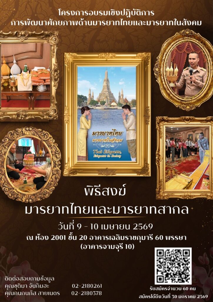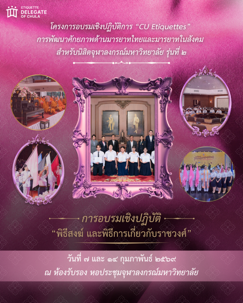 – การอบรมสำหรับนิสิตจุฬาฯ หัวข้อ “การพัฒนาศักยภาพด้านมารยาทไทยและมารยาทในสังคม” ในวันที่ 7 และ 14 กุมภาพันธ์ 2569 ณ ห้องรับรอง หอประชุมจุฬาฯ เพื่อมุ่งพัฒนานิสิตให้มีความรู้ ความเข้าใจ และบุคลิกภาพที่เหมาะสมในฐานะตัวแทนของจุฬาลงกรณ์มหาวิทยาลัย ครอบคลุม