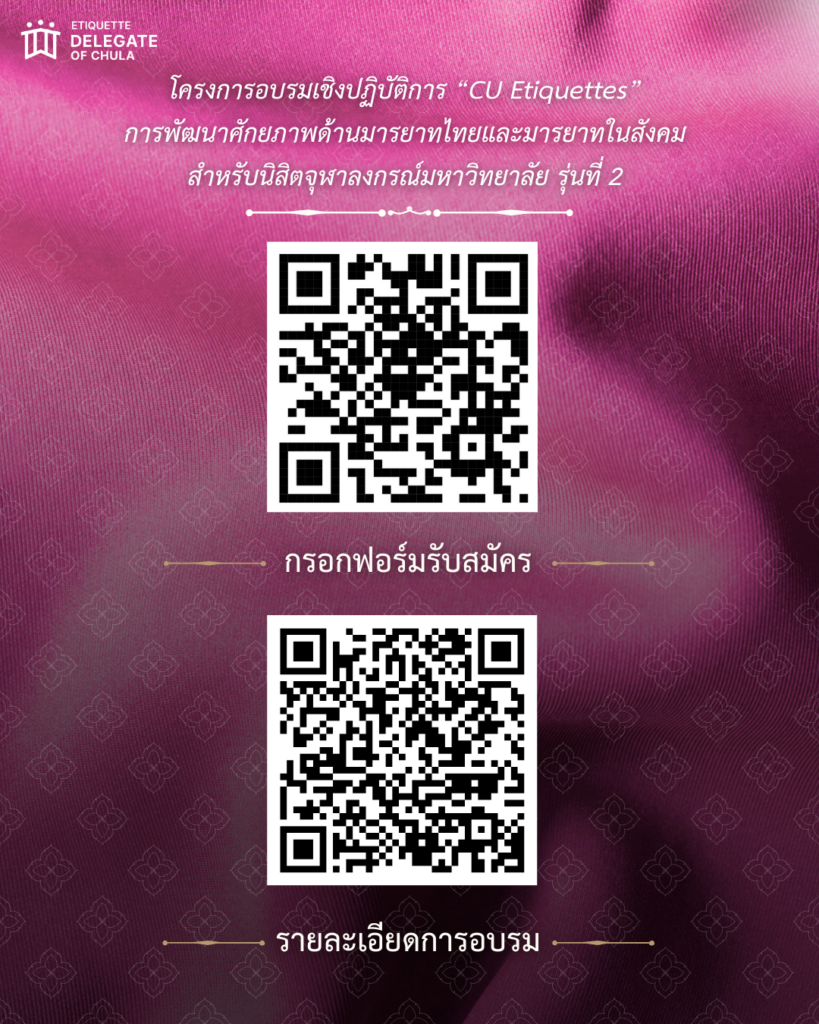 สอบถามเพิ่มเติมได้ที่ E-mail: Chula.Etiquette@gmail.com หรือที่ IG : chula_etiquette