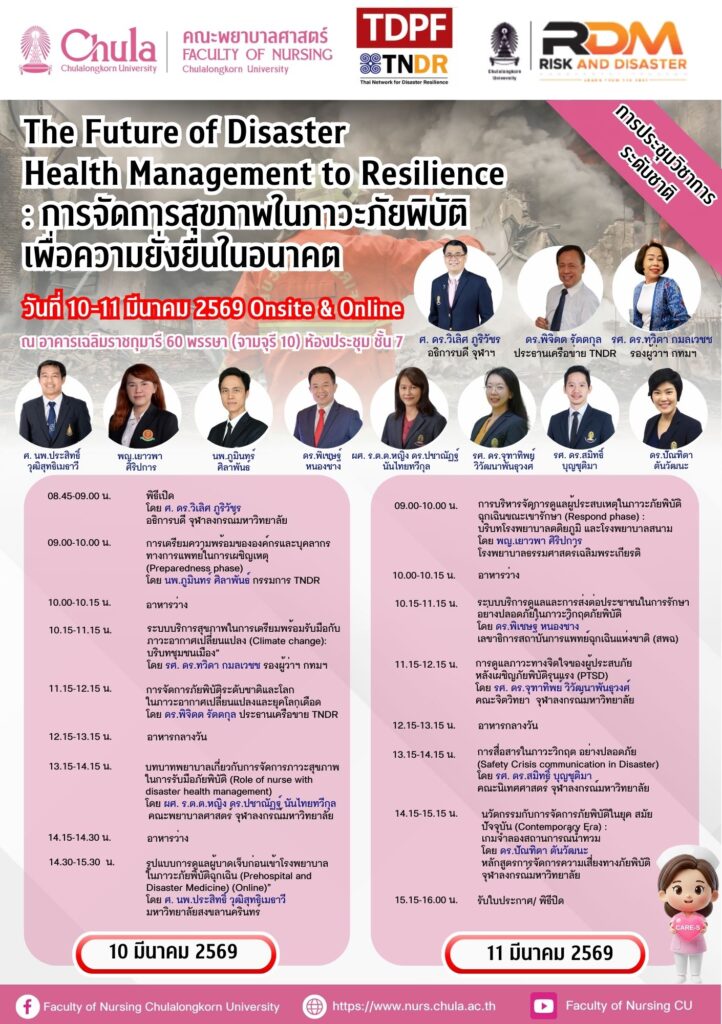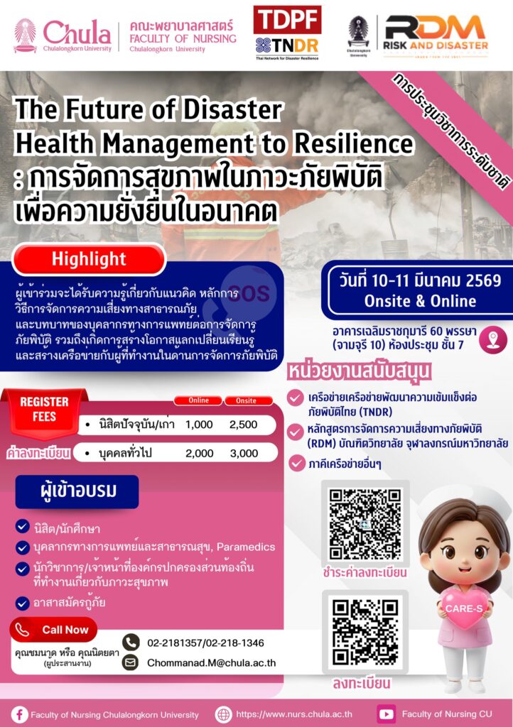 คณะพยาบาลศาสตร์ จุฬาลงกรณ์มหาวิทยาลัย ร่วมกับภาคีเครือข่าย ขอเชิญผู้สนใจร่วมการประชุมวิชาการระดับชาติ ในหัวข้อ “The Future of Disaster Health Management to Resilience: การจัดการสุขภาพในภาวะภัยพิบัติเพื่อความยั่งยืนในอนาคต” ระหว่างวันที่ 10-11 มีนาคม 2569 ในรูปแบบ Online ผ่านระบบ Zoom และ Onsite ณ ห้องประชุมชั้น 7 อาคารเฉลิมราชกุมารี 60 พรรษา (จามจุรี 10) จุฬาฯ