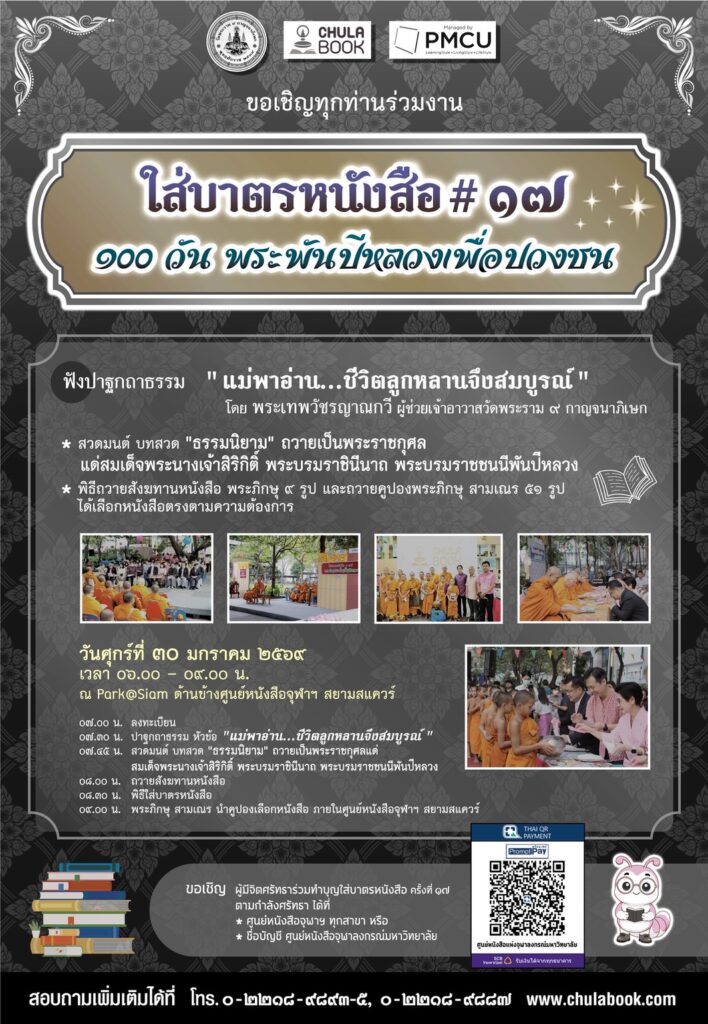 ศูนย์หนังสือจุฬาลงกรณ์มหาวิทยาลัย สำนักงานจัดการทรัพย์สิน จุฬาลงกรณ์มหาวิทยาลัย และวัดพระราม ๙ กาญจนาภิเษก ขอเชิญร่วมกิจกรรม “ใส่บาตรหนังสือ ครั้งที่ 17 : 100 วัน พระพันปีหลวงเพื่อปวงชน” ในวันศุกร์ที่ 30 มกราคม 2569 เวลา 06.00 – 09.00 น. ณ Park @ Siam ด้านข้าง ศูนย์หนังสือจุฬาฯ สยามสแควร์