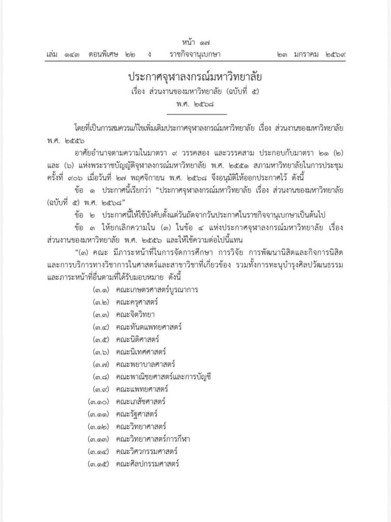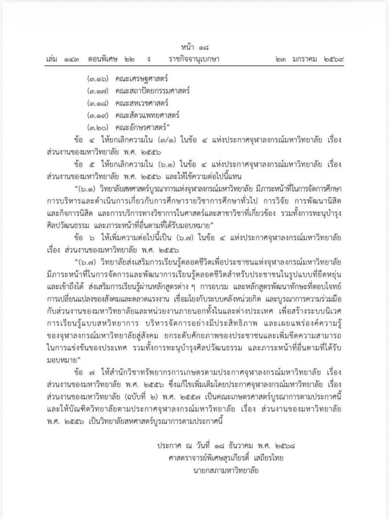 ตามที่ได้มีประกาศจุฬาลงกรณ์มหาวิทยาลัยในราชกิจจานุเบกษา เรื่อง ส่วนงานของมหาวิทยาลัย (ฉบับที่ 5) พ.ศ. 2568 ประกาศ ณ วันที่ 23 มกราคม 2569 โดยมีผลบังคับใช้ตั้งแต่วันที่ 24 มกราคม 2569 ส่งผลให้จุฬาลงกรณ์มหาวิทยาลัยมีคณะและส่วนงานใหม่ดังนี้