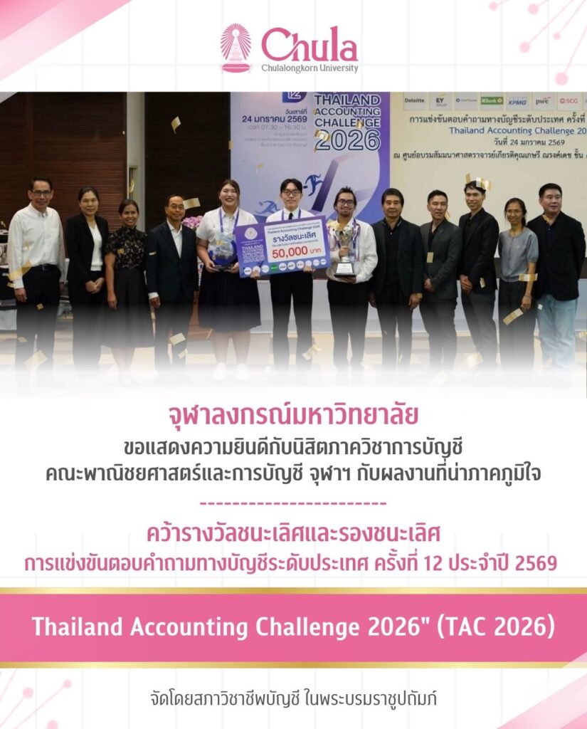 จุฬาลงกรณ์มหาวิทยาลัยขอแสดงความยินดีอย่างยิ่งกับนิสิตภาควิชาการบัญชี คณะพาณิชยศาสตร์และการบัญชี จุฬาฯ คว้ารางวัลชนะเลิศและรองชนะเลิศจากการแข่งขันตอบคำถามทางบัญชีระดับประเทศ ครั้งที่ 12 ประจำปี 2569 (Thailand Accounting Challenge 2026) จัดโดยสภาวิชาชีพบัญชี ในพระบรมราชูปถัมภ์ เมื่อวันที่ 24 มกราคม 2569 ณ ศูนย์อบรมสัมมนาศาสตราจารย์เกียรติคุณเกษรี ณรงค์เดช ชั้น 6 อาคารสภาวิชาชีพบัญชีการแข่งขันครั้งนี้จัดขึ้นเพื่อเปิดโอกาสให้นิสิตได้แสดงความรู้ ความสามารถ และประสบการณ์ด้านวิชาชีพบัญชีในเวทีระดับประเทศ โดยมีมหาวิทยาลัยจากทั่วประเทศเข้าร่วมการแข่งขัน