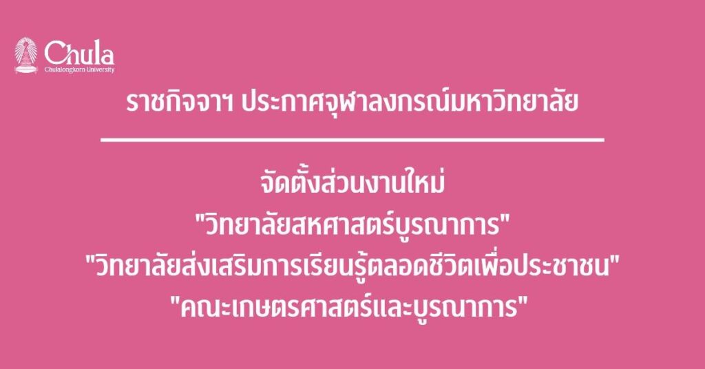 ราชกิจจาฯ ประกาศจุฬาฯ จัดตั้งส่วนงานใหม่”วิทยาลัยสหศาสตร์บูรณาการ”วิทยาลัยส่งเสริมการเรียนรู้ตลอดชีวิตเพื่อประชาชน” และ “คณะเกษตรศาสตร์และบูรณาการ”