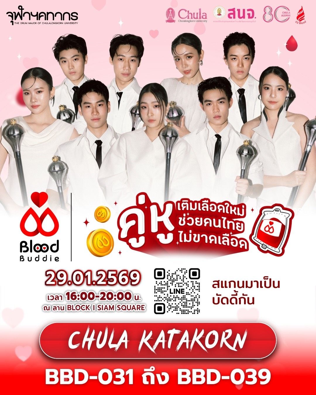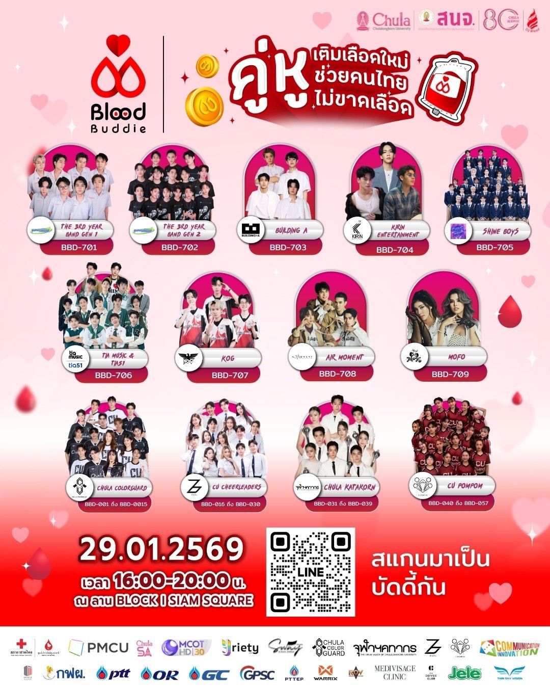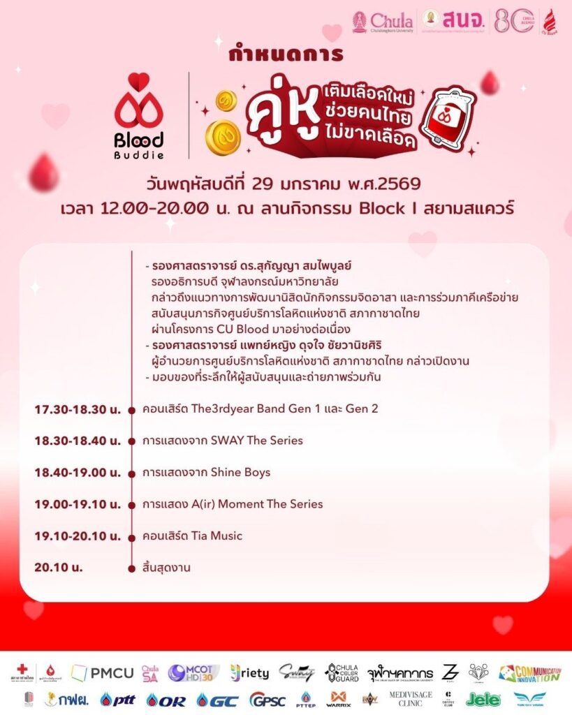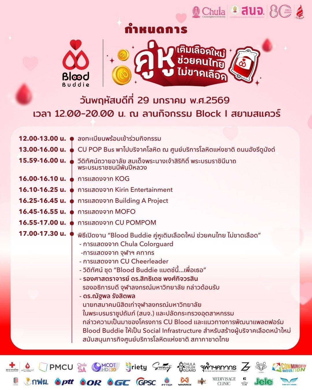 จุฬาลงกรณ์มหาวิทยาลัย ร่วมกับแพลตฟอร์ม Blood Buddie จัดกิจกรรม “Blood Buddie คู่หูเติมเลือดใหม่ ช่วยคนไทย ไม่ขาดเลือด” เพื่อรณรงค์ให้คนรุ่นใหม่ตระหนักถึงความสำคัญของการบริจาคโลหิต และร่วมเป็นส่วนหนึ่งในการเสริมสร้างคลังโลหิตให้เพียงพอต่อความต้องการของประเทศ โดยกิจกรรมจะจัดขึ้นในวันพฤหัสบดีที่ 29 มกราคม 2569 ณ ลานบล็อคไอ สยามสแควร์ ตั้งแต่เวลา 13.00–16.00 น. (เริ่มลงทะเบียนตั้งแต่เวลา 12.00 น.)