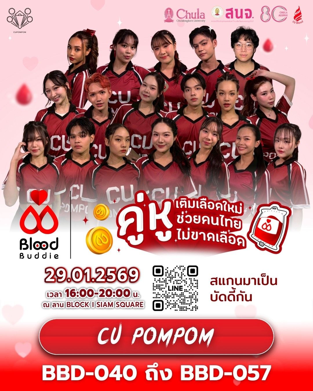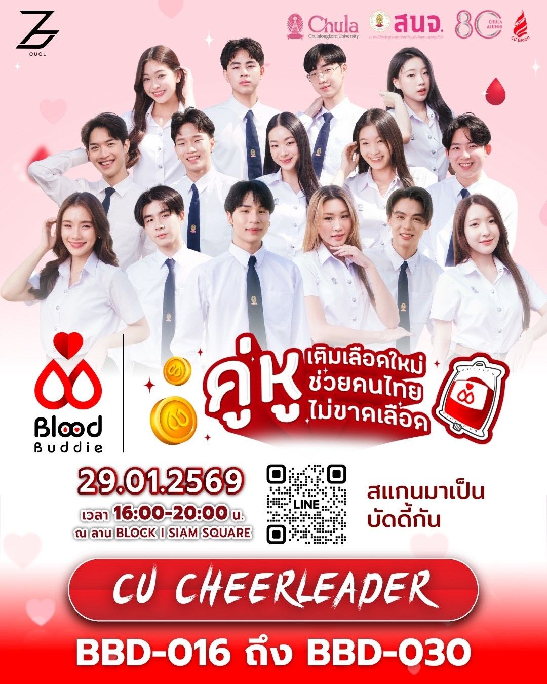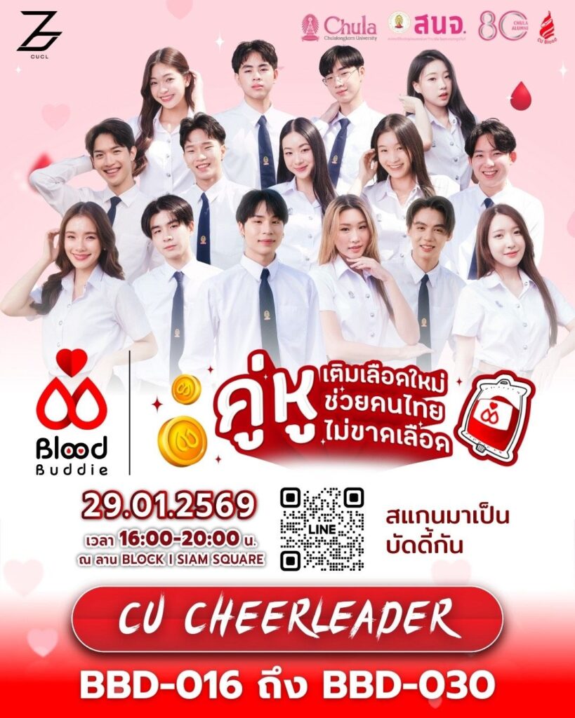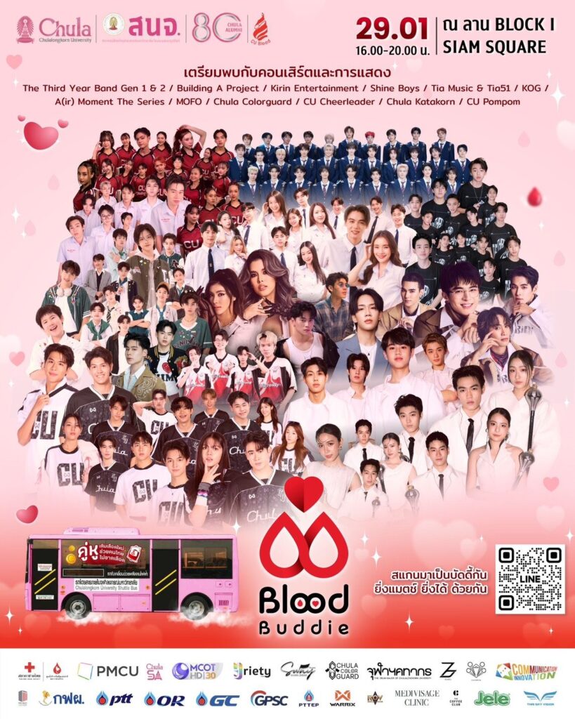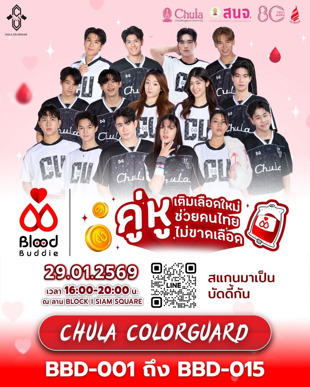 จุฬาลงกรณ์มหาวิทยาลัย ร่วมกับแพลตฟอร์ม Blood Buddie จัดกิจกรรม “Blood Buddie คู่หูเติมเลือดใหม่ ช่วยคนไทย ไม่ขาดเลือด” เพื่อรณรงค์ให้คนรุ่นใหม่ตระหนักถึงความสำคัญของการบริจาคโลหิต และร่วมเป็นส่วนหนึ่งในการเสริมสร้างคลังโลหิตให้เพียงพอต่อความต้องการของประเทศ โดยกิจกรรมจะจัดขึ้นในวันพฤหัสบดีที่ 29 มกราคม 2569 ณ ลานบล็อคไอ สยามสแควร์ ตั้งแต่เวลา 13.00–16.00 น. (เริ่มลงทะเบียนตั้งแต่เวลา 12.00 น.)