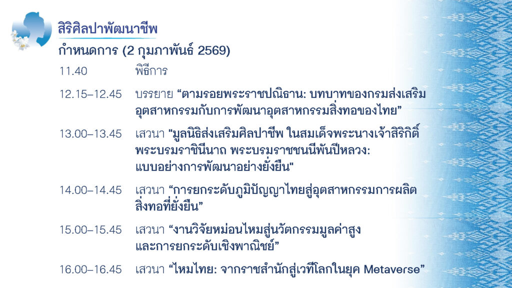 วันที่ 2 กุมภาพันธ์ 2569 เวลา 12.15 – 16.45 น. ฟังการเสวนาในหัวข้อเกี่ยวกับงานอุตสาหกรรมสิ่งทออันสืบเนื่องจากโครงการพระราชดำริ ได้แก่