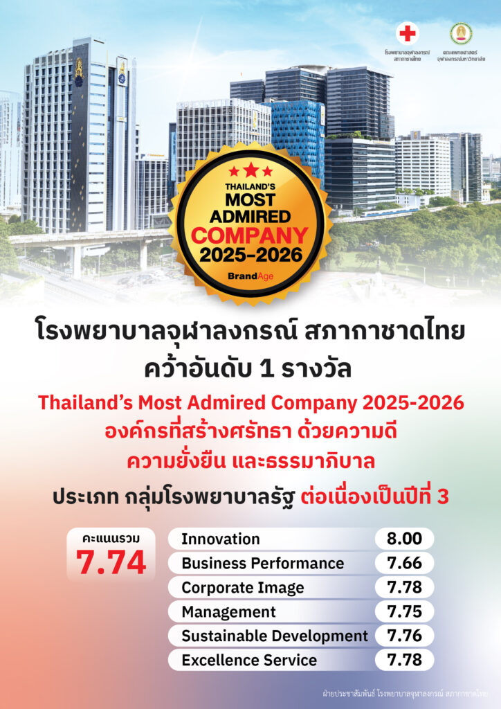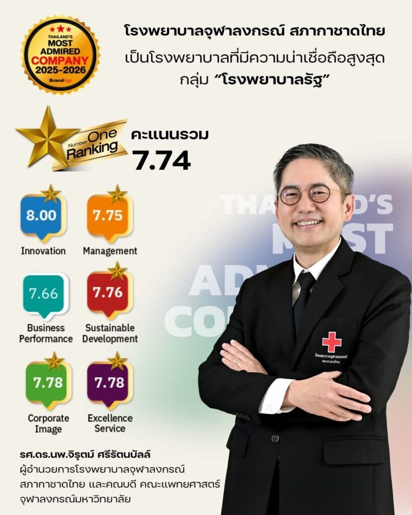 โรงพยาบาลจุฬาลงกรณ์ สภากาชาดไทย ครองอันดับ 1 จากผลวิจัย 2025-2026 Thailand’s Most Admired Company ในกลุ่มโรงพยาบาลรัฐ (Government Hospital) จากการสำรวจโดยนิตยสาร BrandAge และ BrandAge Online ตอกย้ำบทบาท “ที่พึ่งทางสุขภาพ” ของสังคมไทย