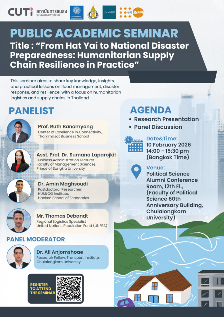 สถาบันการขนส่ง จุฬาลงกรณ์มหาวิทยาลัย ขอเชิญผู้สนใจเข้าร่วมงานเสวนาวิชาการสาธารณะ ภายใต้หัวข้อ “From Hat Yai to National Disaster Preparedness: Humanitarian Supply Chain Resilience in Practice” ในวันอังคารที่ 10 กุมภาพันธ์ 2569 เวลา 14.00–15.30 น. ณ ห้องประชุมสมาคมนิสิตเก่ารัฐศาสตร์ ชั้น 12 อาคารเกษม อุทยานิน คณะรัฐศาสตร์ จุฬาฯ เพื่อแลกเปลี่ยนองค์ความรู้ แนวคิด และบทเรียนเชิงปฏิบัติด้านการจัดการอุทกภัย การรับมือภัยพิบัติ และการพัฒนาความยืดหยุ่นของห่วงโซ่อุปทานเพื่อการช่วยเหลือด้านมนุษยธรรม โดยมุ่งเน้นกรณีศึกษาในบริบทของประเทศไทย เพื่อเชื่อมโยงจากประสบการณ์ระดับพื้นที่สู่การกำหนดนโยบายและการเตรียมพร้อมในระดับประเทศ