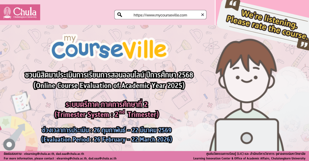 เชิญชวนนิสิตจุฬาฯ ประเมินการเรียนการสอนออนไลน์ผ่านระบบ myCourseVille ระบบตรีภาค ภาคการศึกษาที่ 2 ปีการศึกษา 2568