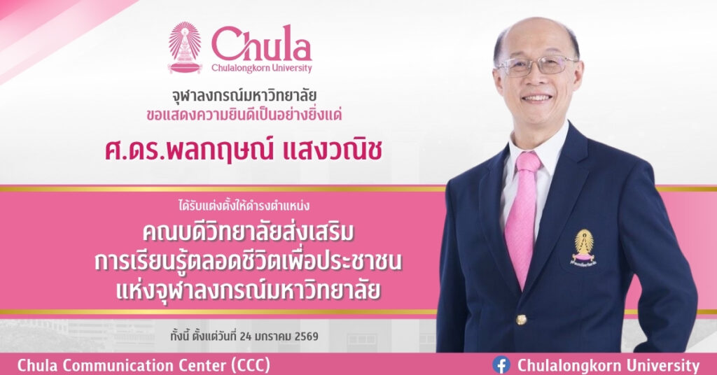 จุฬาลงกรณ์มหาวิทยาลัยขอแสดงความยินดีเป็นอย่างยิ่งแด่ ศ.ดร.พลกฤษณ์ แสงวณิช ประธานคณะกรรมการจัดตั้งสถาบันการเรียนรู้ตลอดชีวิตเพื่อประชาชนแห่งจุฬาลงกรณ์มหาวิทยาลัย ได้รับแต่งตั้งให้ดำรงตำแหน่งคณบดีวิทยาลัยส่งเสริมการเรียนรู้ตลอดชีวิตเพื่อประชาชนแห่งจุฬาลงกรณ์มหาวิทยาลัย ตั้งแต่วันที่ 24 มกราคม 2569 ตามคำสั่งจุฬาลงกรณ์มหาวิทยาลัย ที่ 0440/2569 เรื่อง แต่งตั้งคณบดีวิทยาลัยส่งเสริมการเรียนรู้ตลอดชีวิตเพื่อประชาชนแห่งจุฬาลงกรณ์มหาวิทยาลัย ลงวันที่ 30 มกราคม 2569