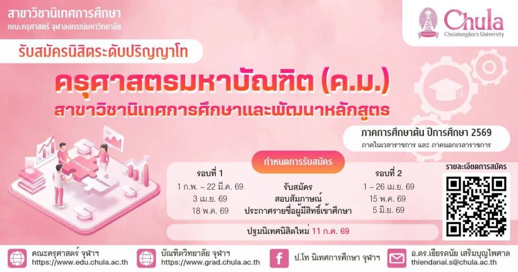 หลักสูตรครุศาสตรมหาบัณฑิต สาขาวิชานิเทศการศึกษาและพัฒนาหลักสูตร ภาควิชานโยบาย การจัดการ และความเป็นผู้นำทางการศึกษา คณะครุศาสตร์ จุฬาลงกรณ์มหาวิทยาลัยเปิดรับสมัครนิสิตใหม่ ปีการศึกษา 2569 ทั้งหลักสูตรในเวลาราชการและนอกเวลาราชการ